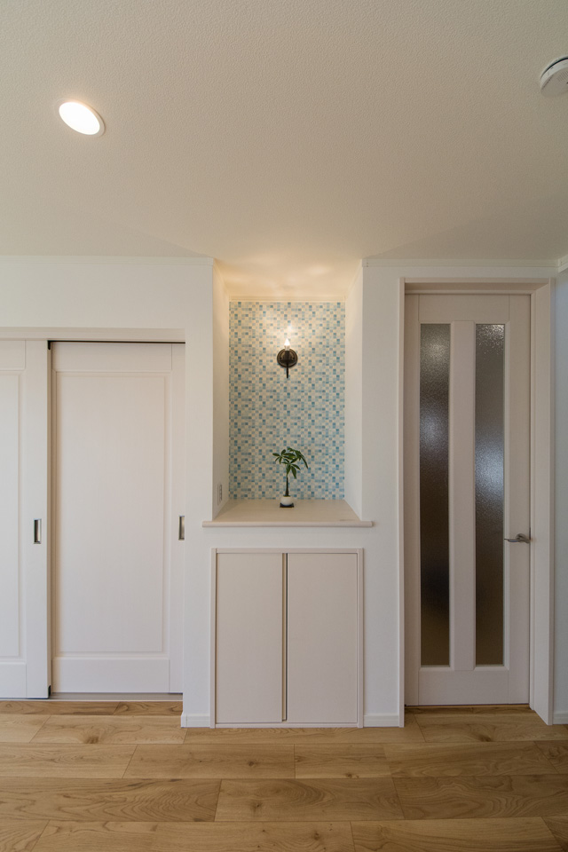 爽やかな印象を与える青のモザイク柄アクセントクロスをあしらった収納スペース。