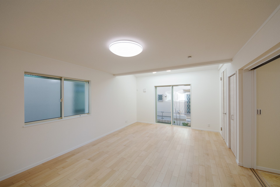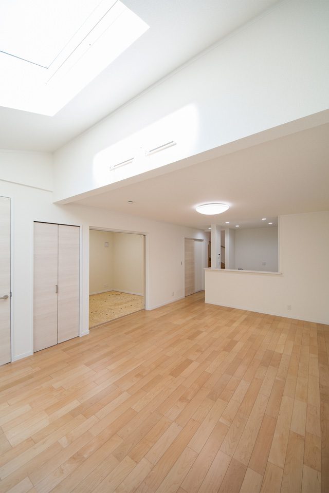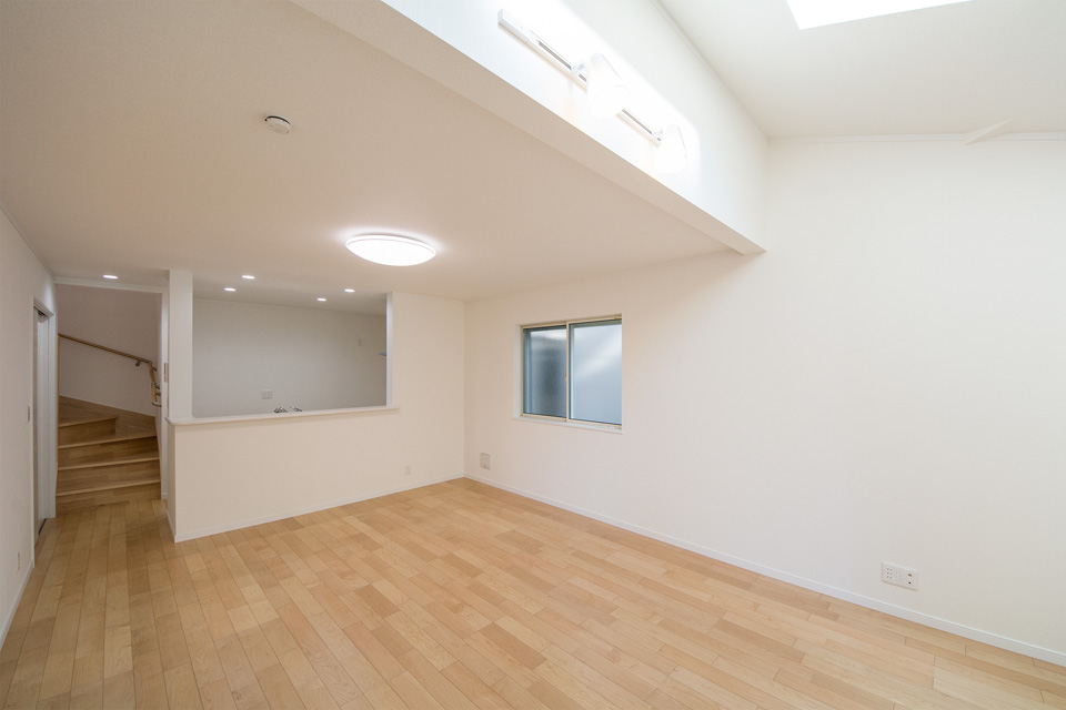 ナチュラルなフローリングと白いクロスで、木の温もりを感じる優しい癒し空間。 トップライトからは優しい光が差し込み、家族みんなが集うリビングを明るく包み込みます。