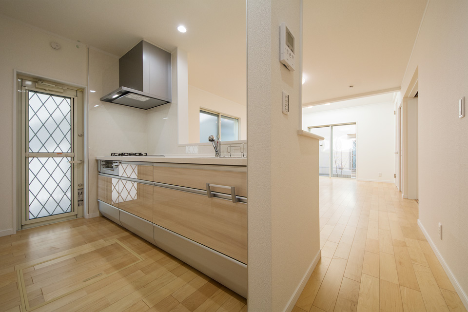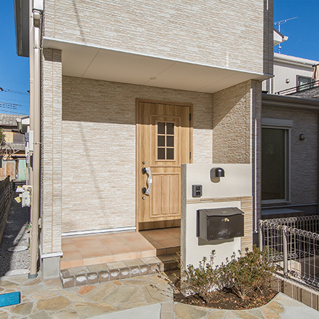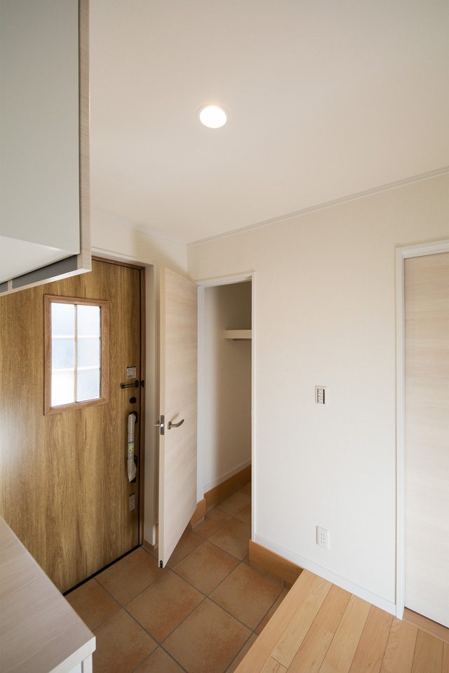 勝手口は扉を閉めたまま換気もできる防犯仕様。ナチュラルな風合いの配色も魅力です。