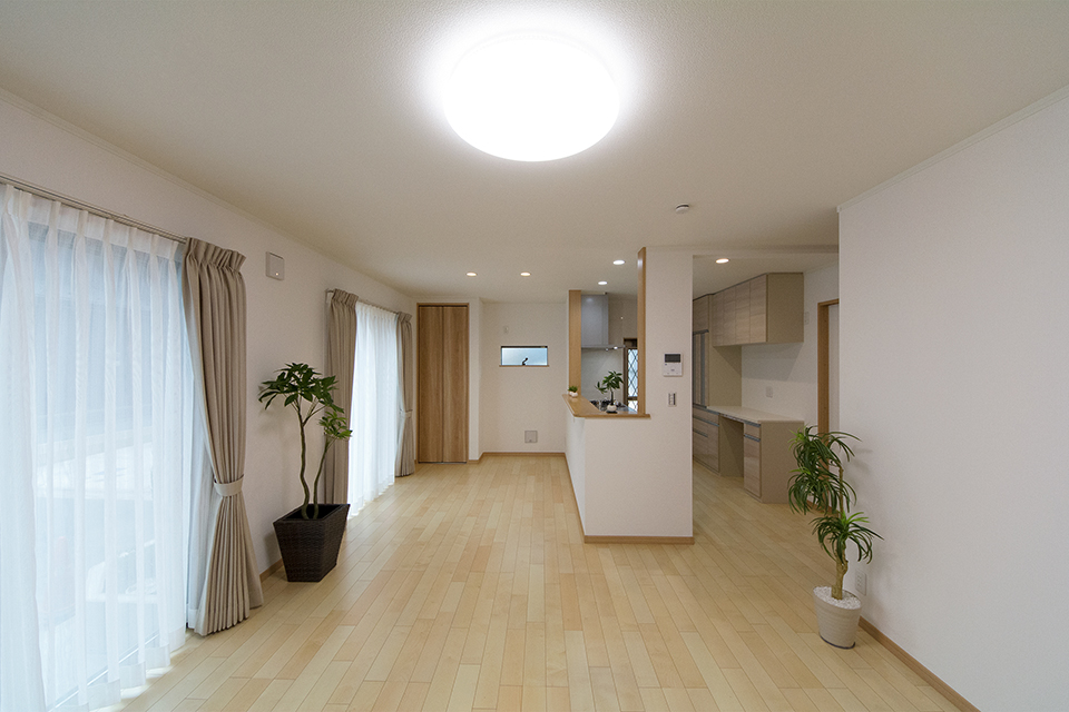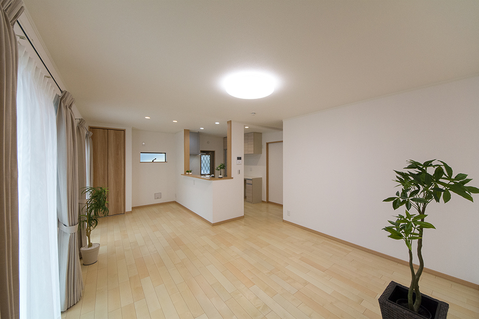窓から自然のやさしい光が降り注ぎ、明るく開放的なリビング空間に。