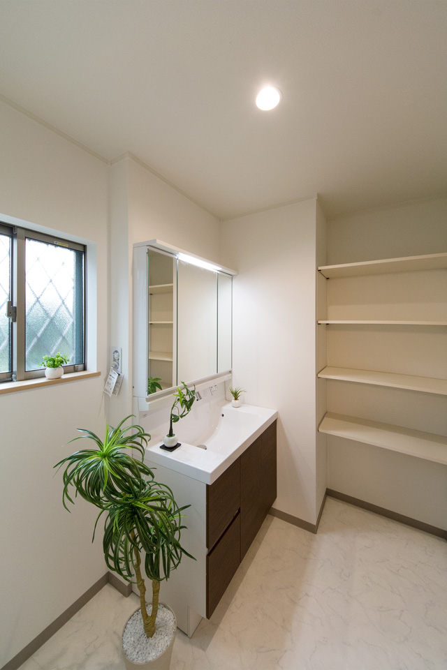 モカ色の洗面化粧台がナチュラルな雰囲気の空間を演出。