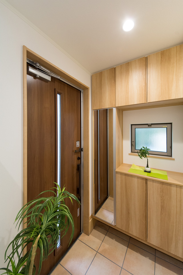 縦スリットから自然の光が差し込み明るく開放感のある玄関。