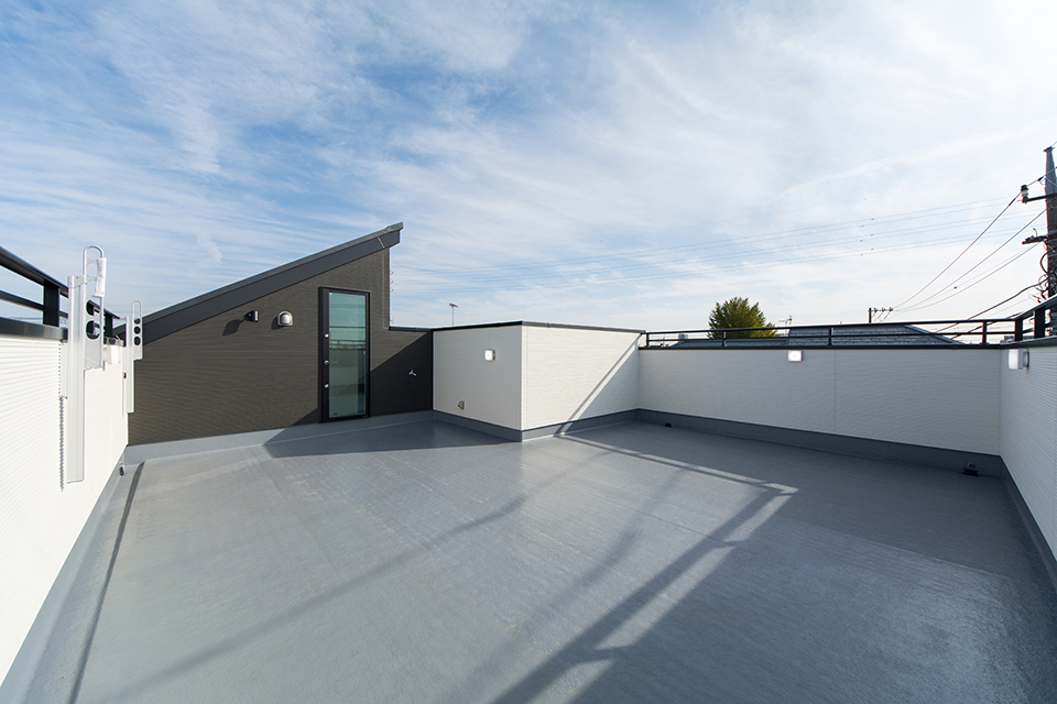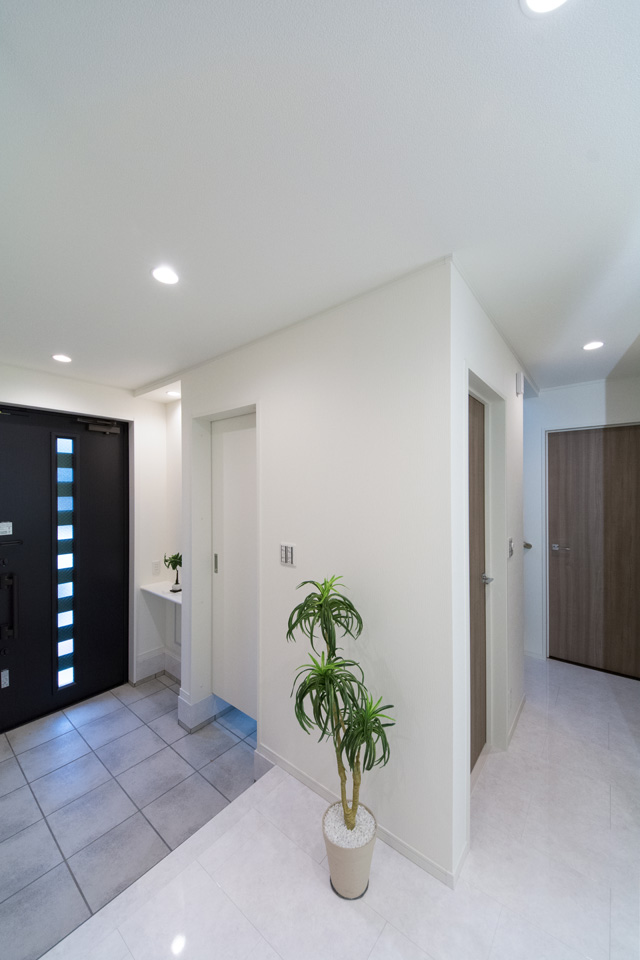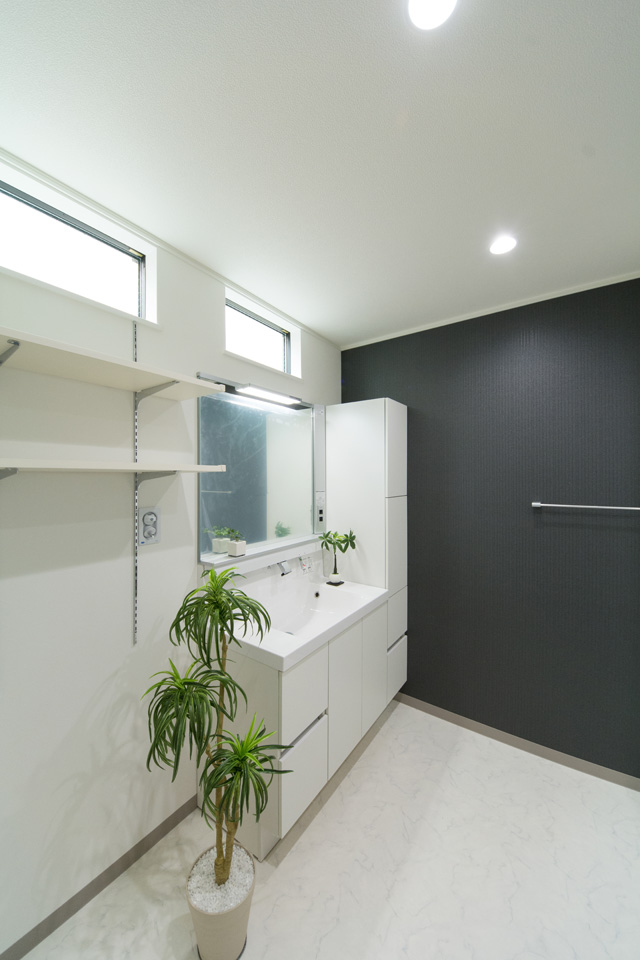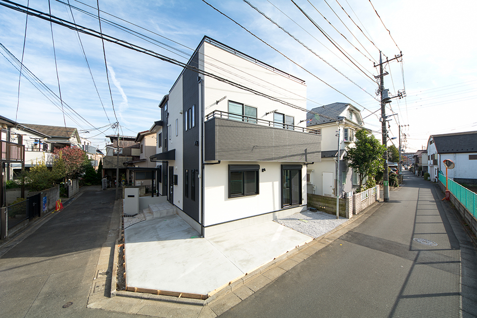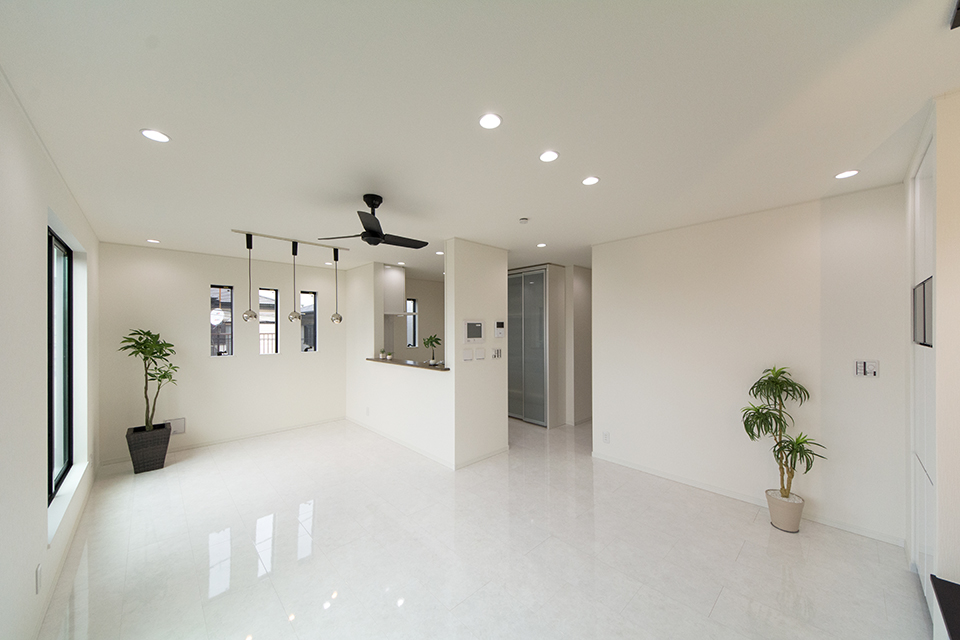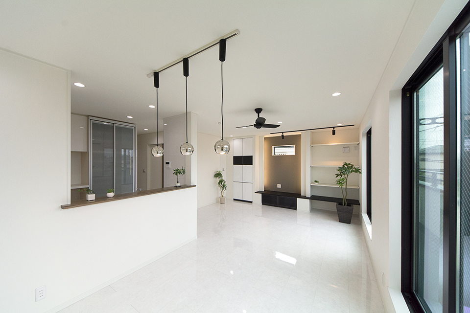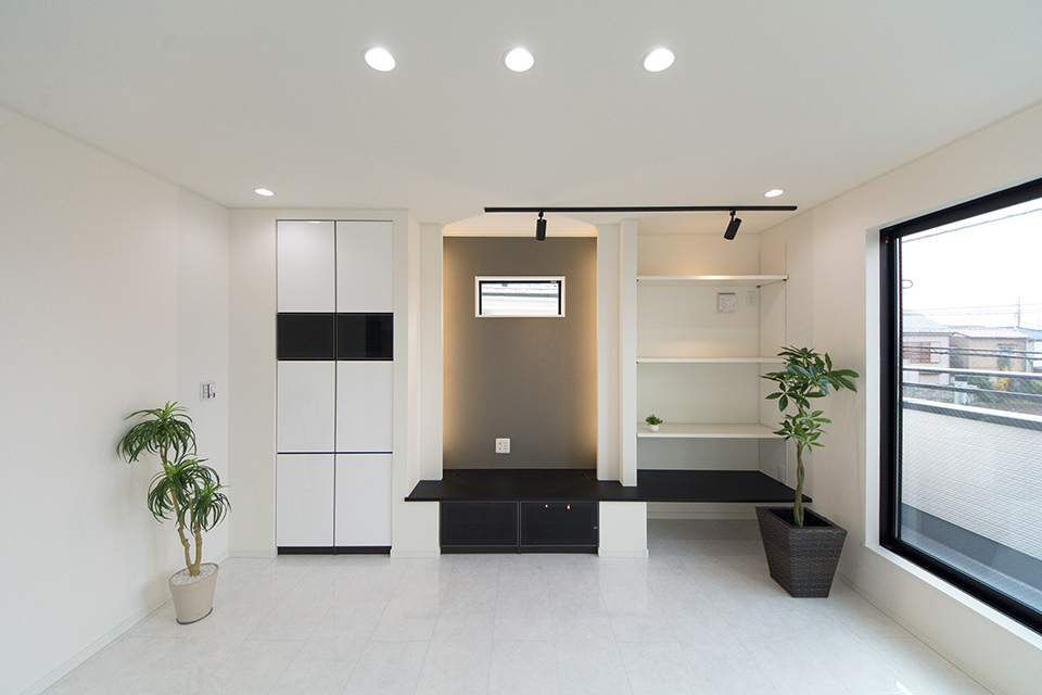 モダンな表情を見せるスリット柄サイディングを、白と黒で張り分けしたスタイリッシュ&モダンなデザイン。 室内も白を基調としたモダンな空間に。