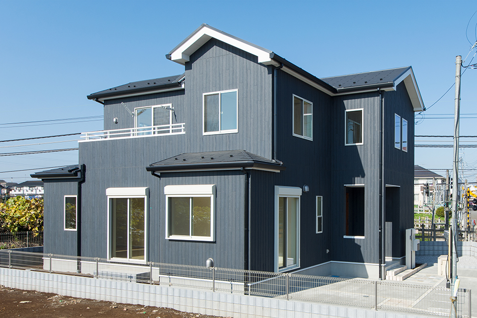 木目調黒のサイディングを全面に纏ったスタイリッシュ&モダンなデザイン。 黒の外壁が個性を放ち、クールな印象に仕上がりました。