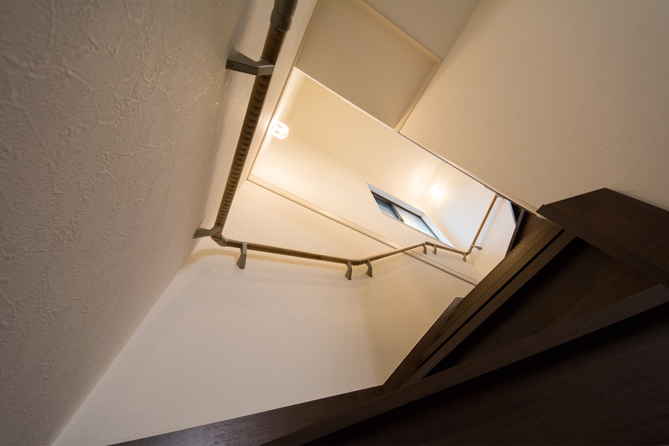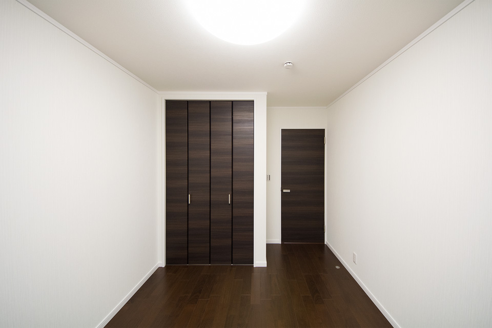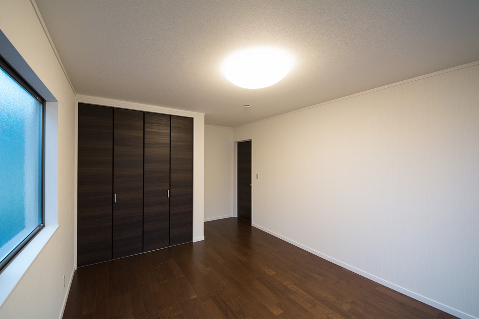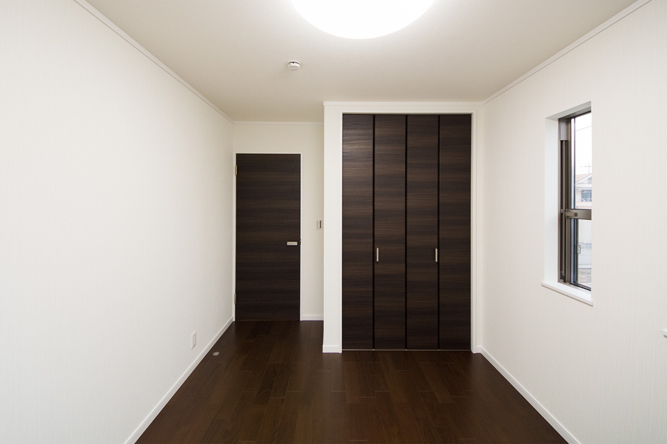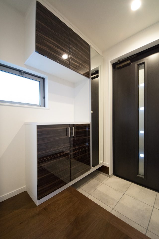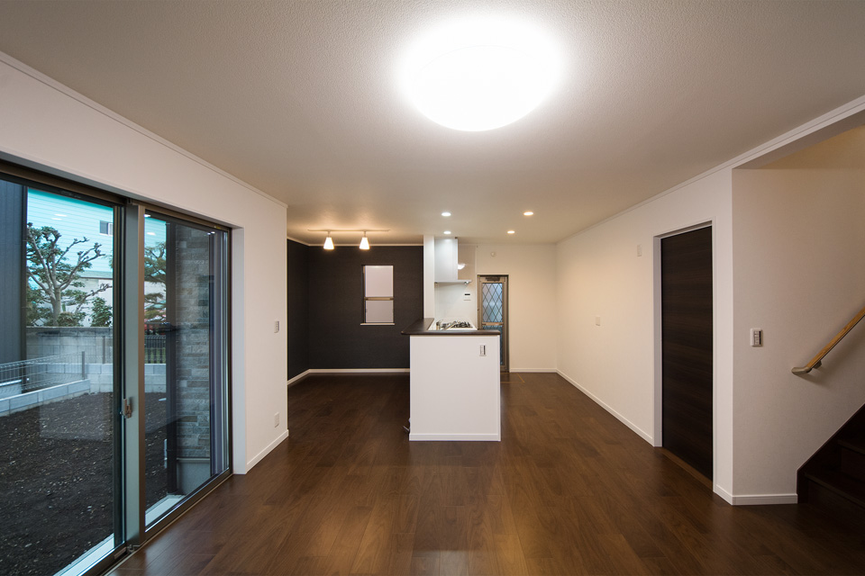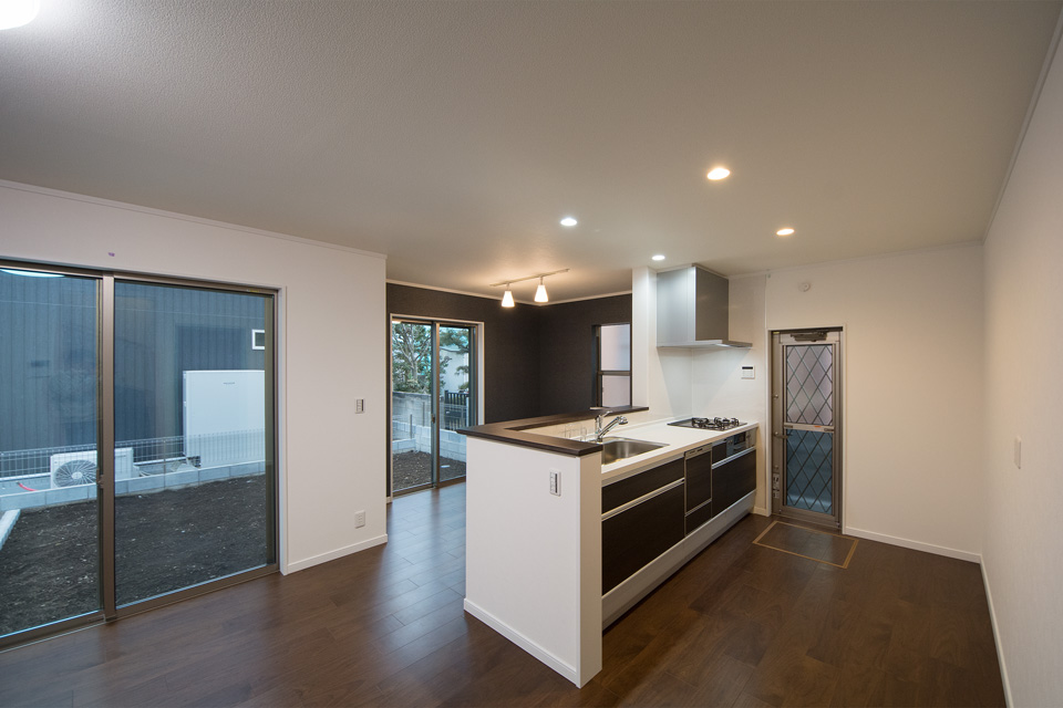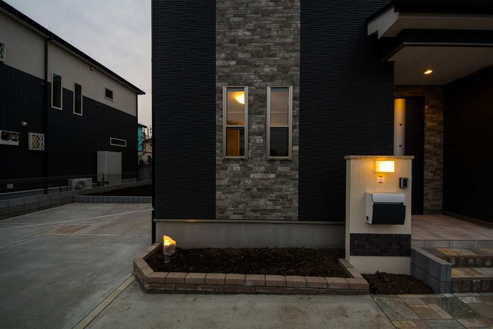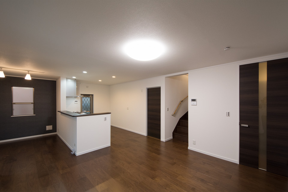 外観・室内共にダークな色を基調としたエレガントな佇まい。 室内はダークな色の床や建具がクロスの白を引き立たせ安堵感を与える空間に。