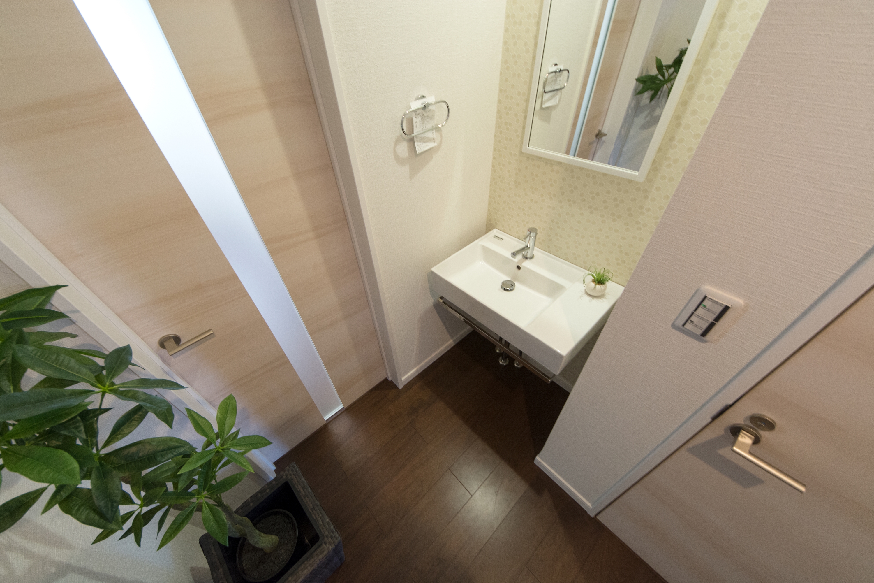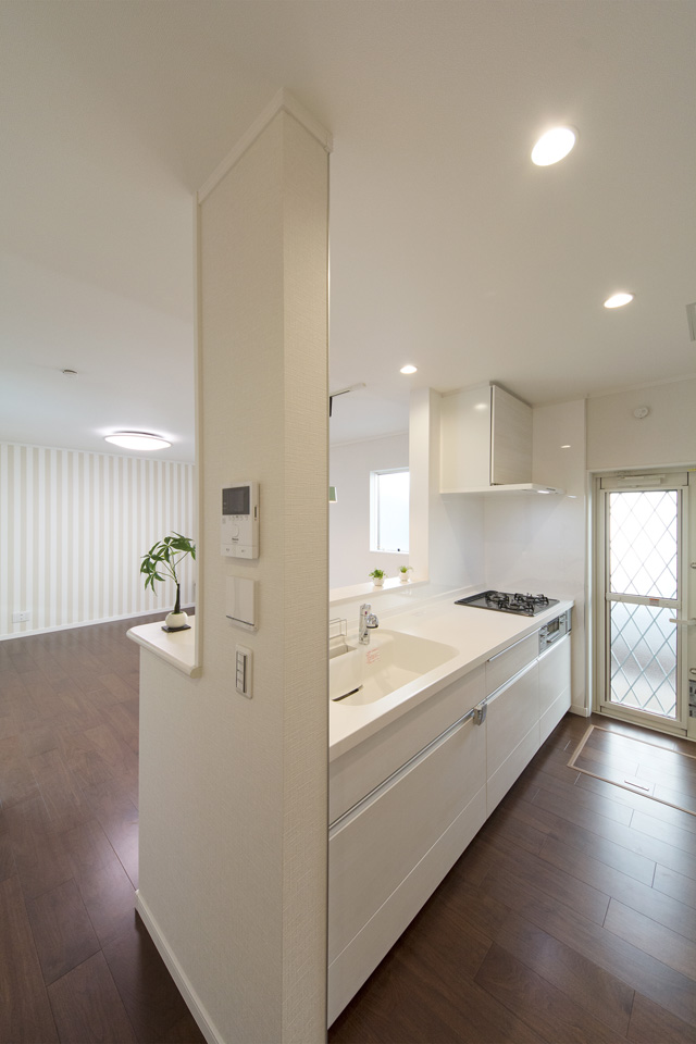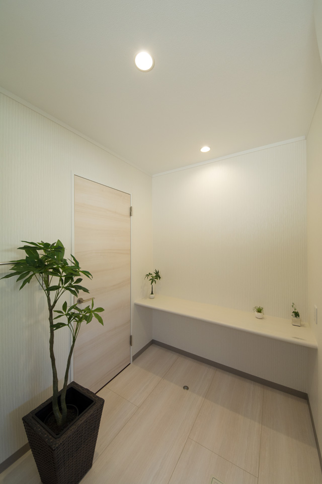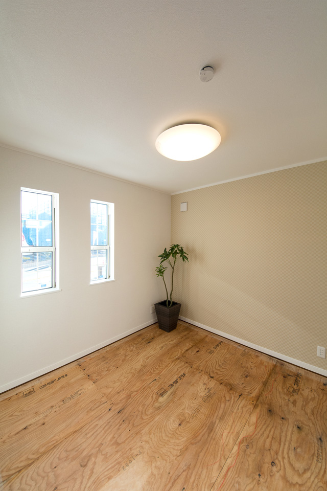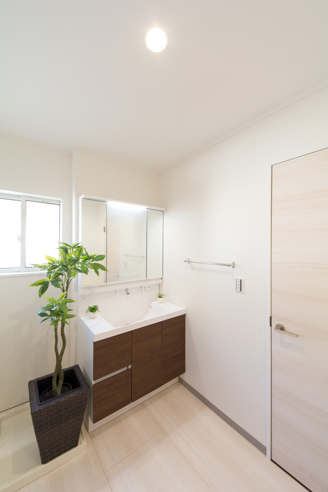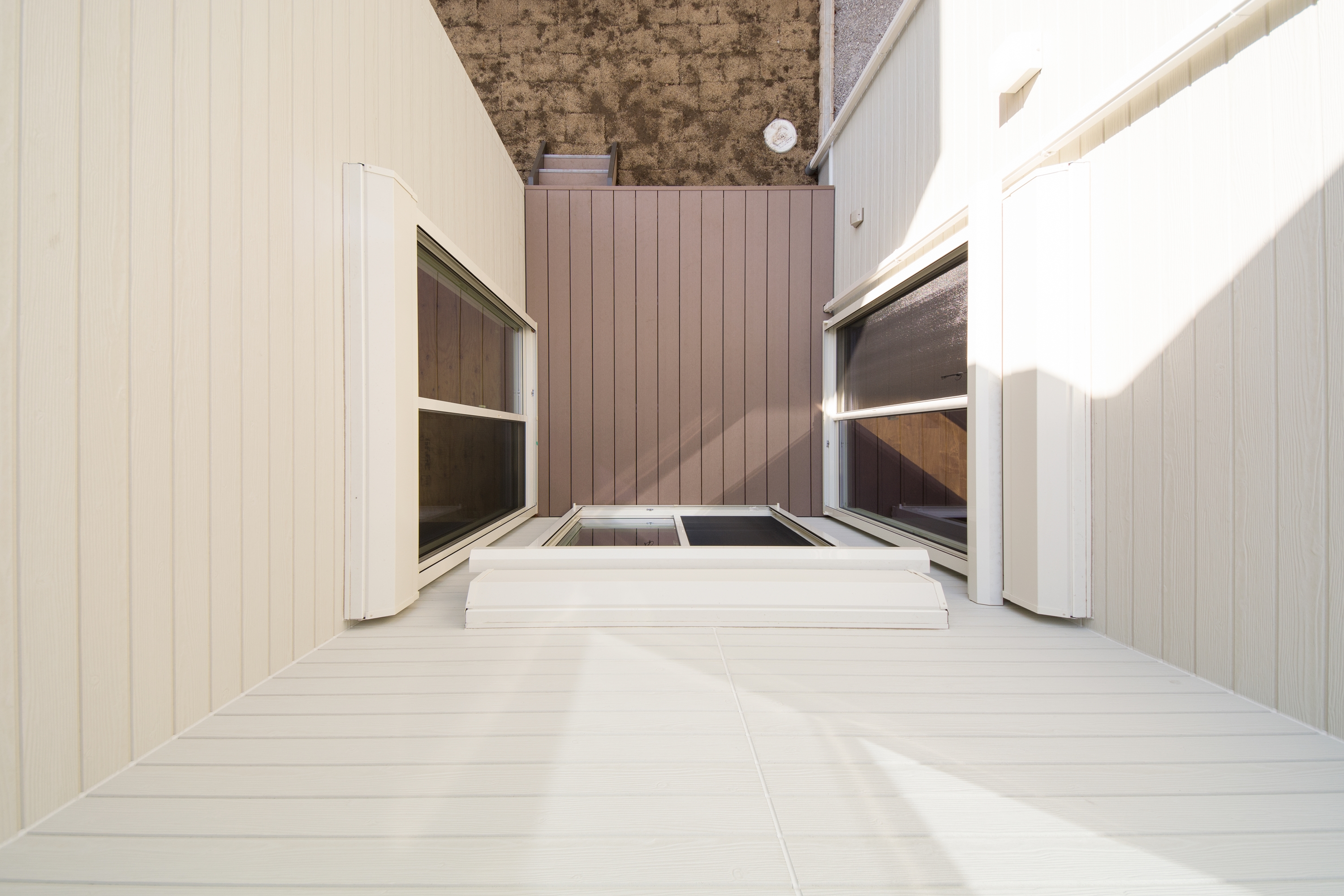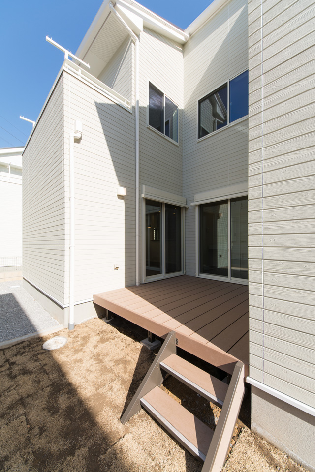 外観は白の木目調サイディングに、グリーンのよろい戸風窓飾りをあしらったナチュラル&モダン。コの字に囲まれたウッドデッキの中庭を中心に、家族のコミュニケーションを育む工夫がちりばめられた間取りです。