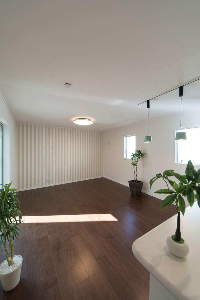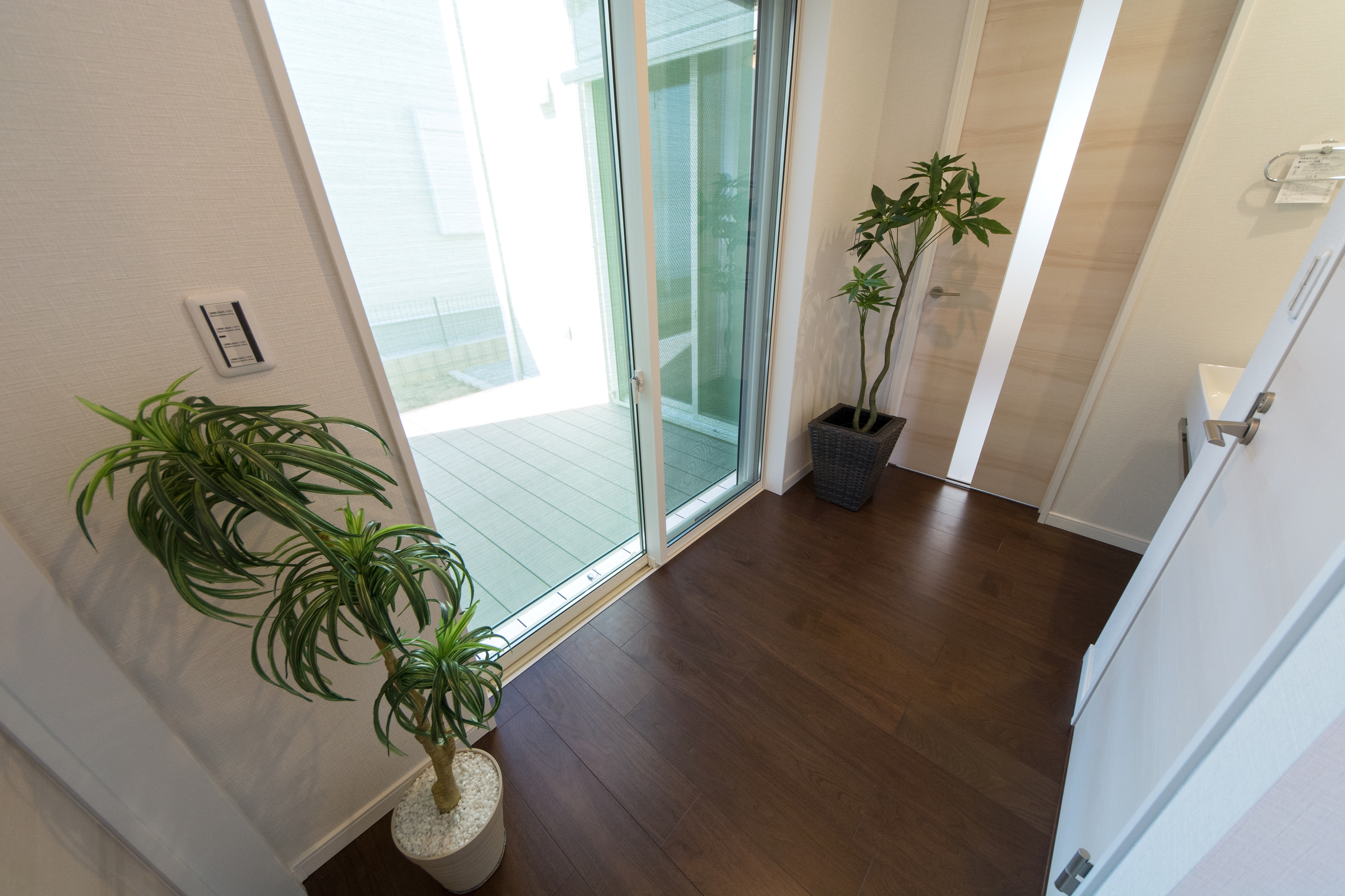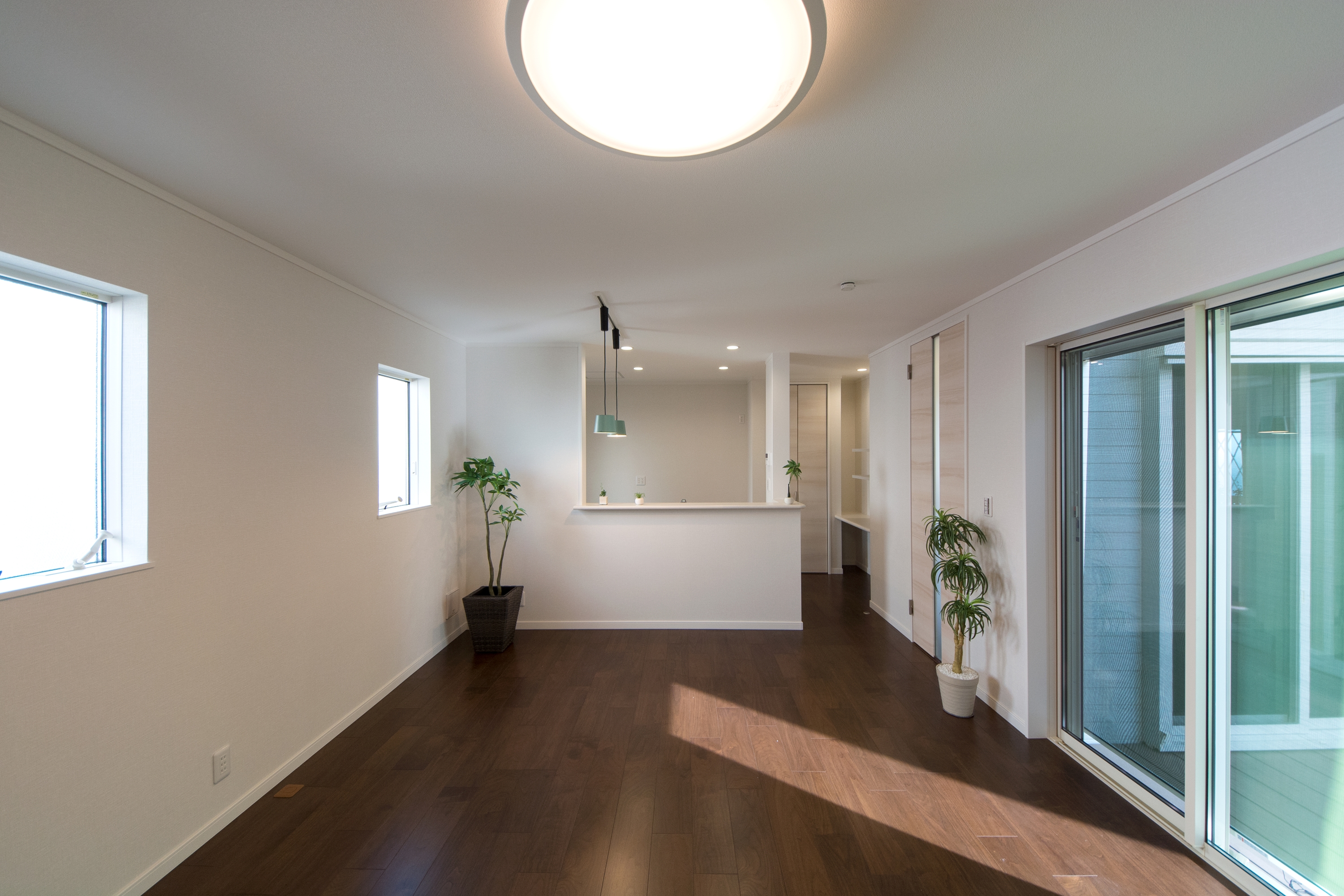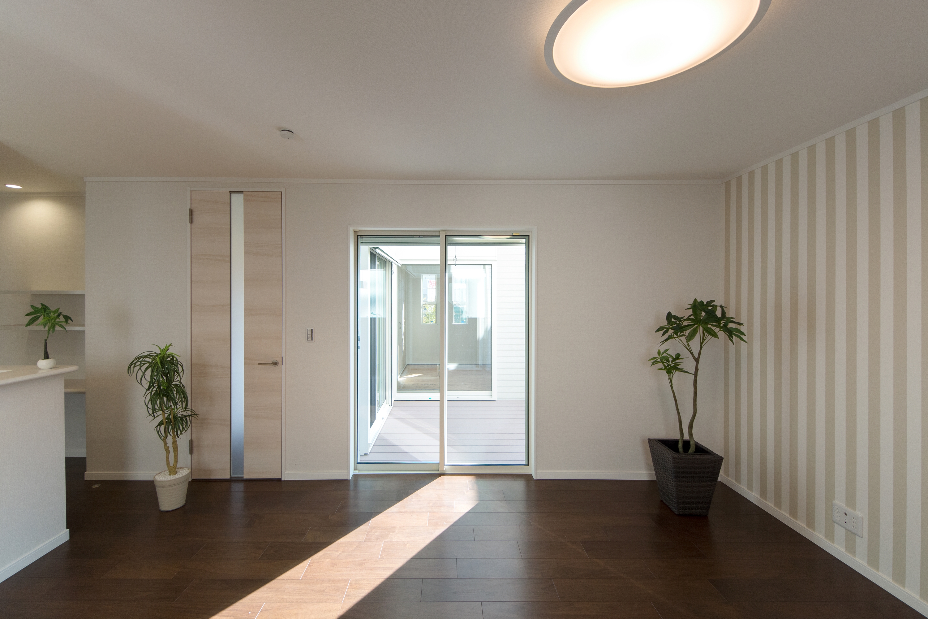 家族の笑顔がリビングに集う ウッドデッキの中庭がある家