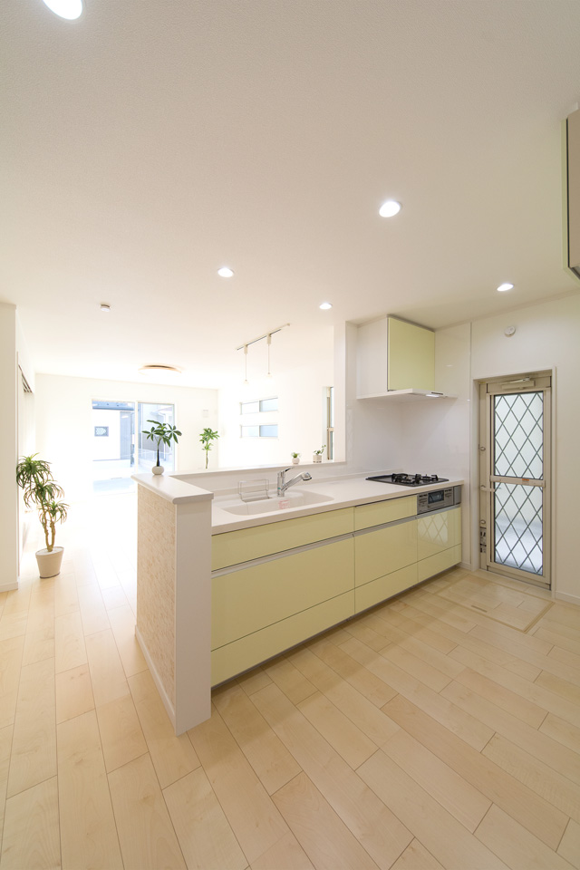 ミストグリーンのキッチンが爽やかな印象を与えます。