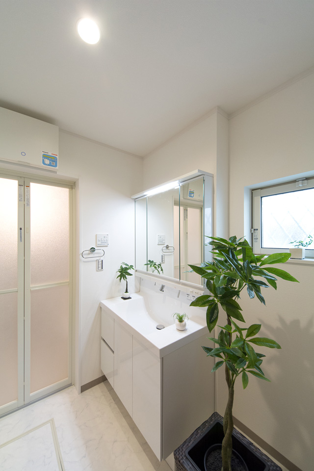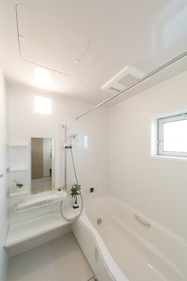 白のブリック調を全面にあしらった外観に、グリーンの窓モールが爽やかな印象をプラス。エレガントなアイアン調妻飾りがアクセントになったナチュラル&モダン。