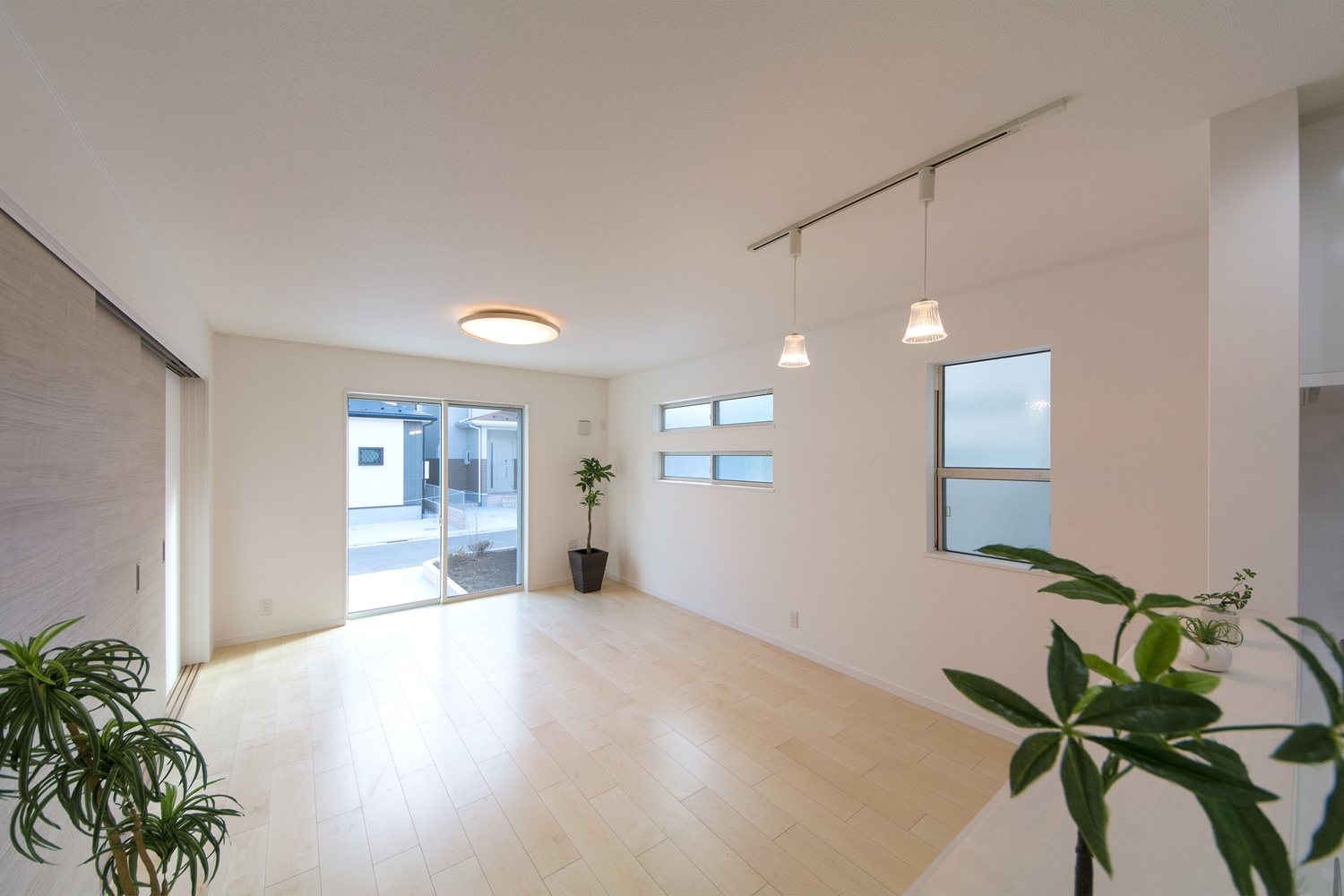窓から自然のやさしい光が降り注ぎ、明るく開放的なリビング空間に。