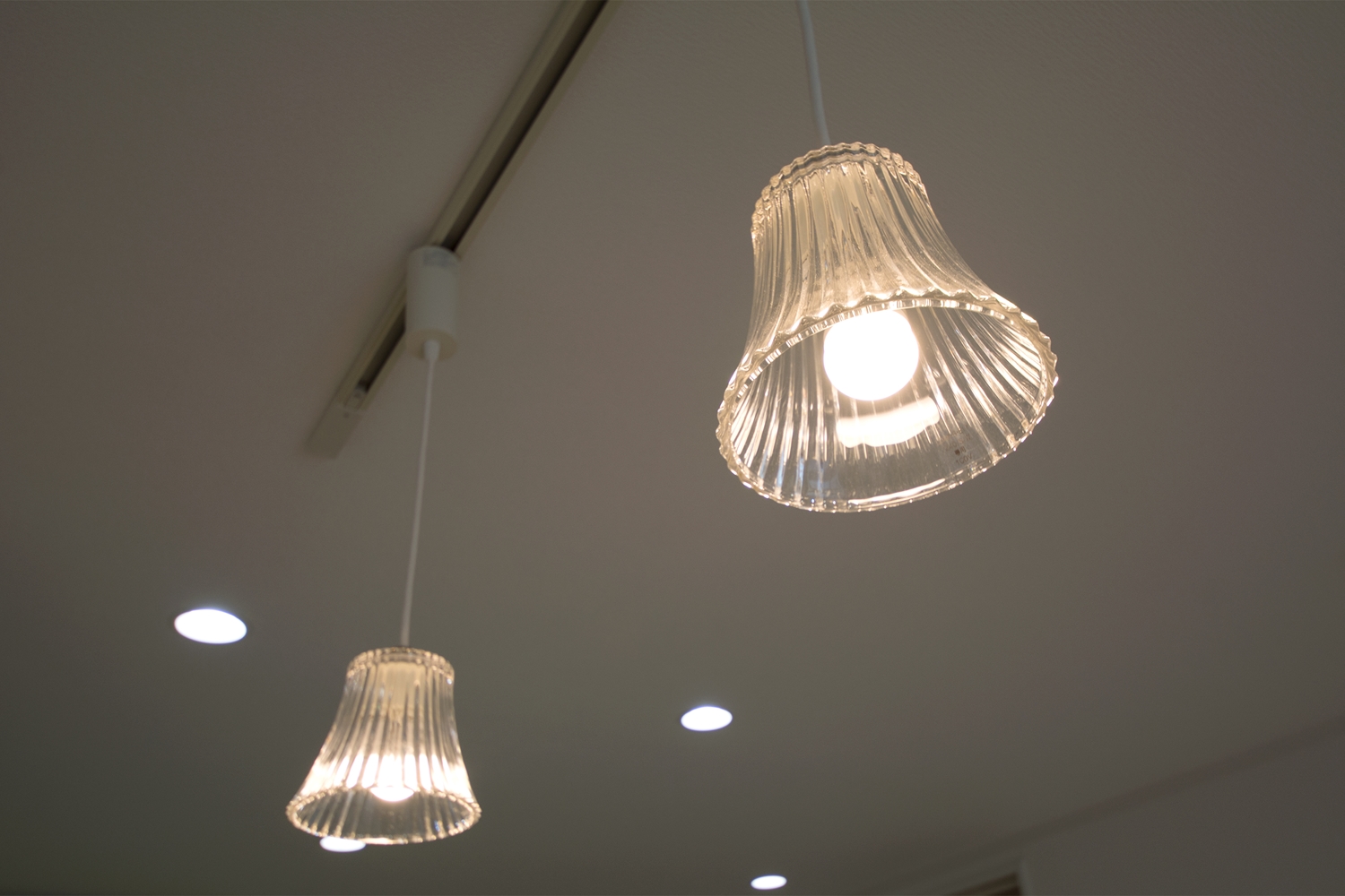 ガラスシェードのペンダントライトがダイニング空間を彩ります。