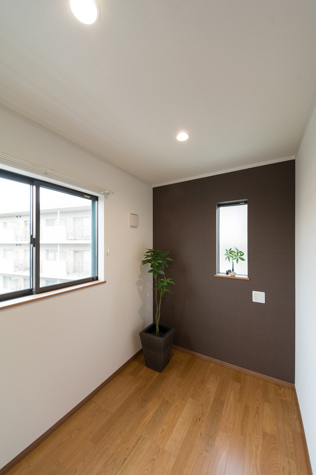 ダークブラウンのアクセントクロスが印象的な書斎スペース。