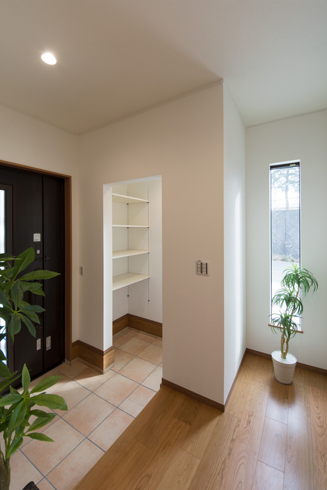 ベビーカーや傘立てなどが収納できる便利な土間収納を設えた玄関。