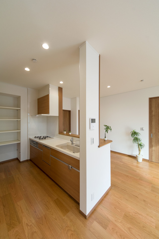 あたたかみのある配色でナチュラルな雰囲気のキッチンスペース。