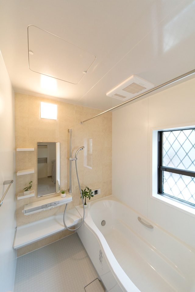 ナチュラルでやさしい配色で心地よい穏やかな空間のバスルーム。