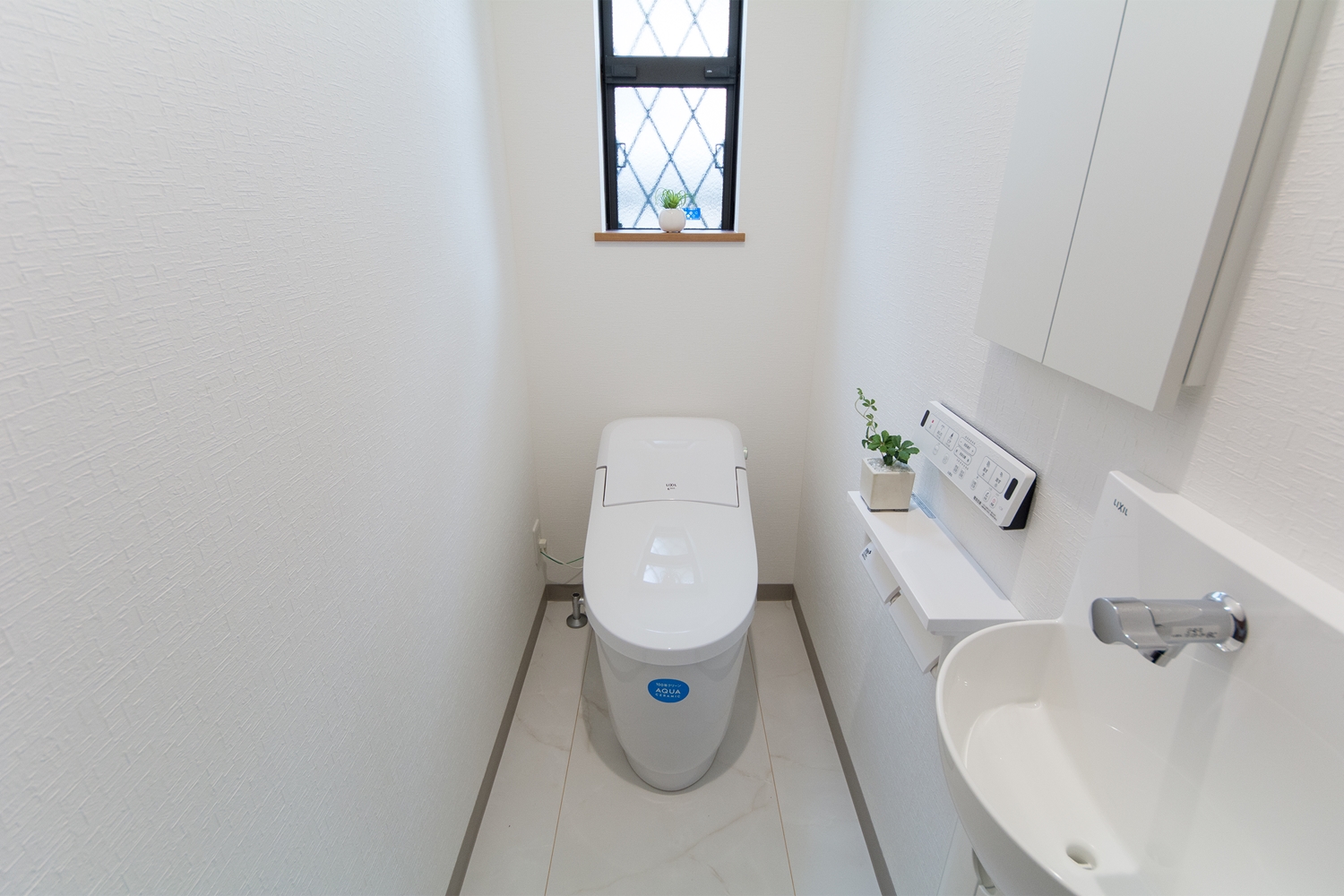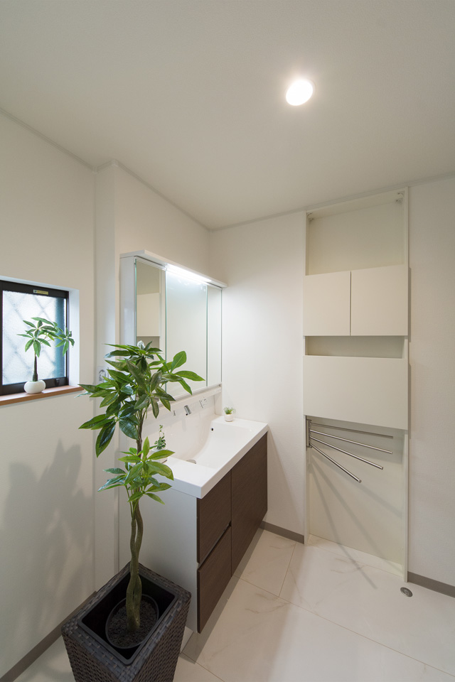 モカ色の洗面化粧台がナチュラルな雰囲気の空間を演出するサニタリールーム。