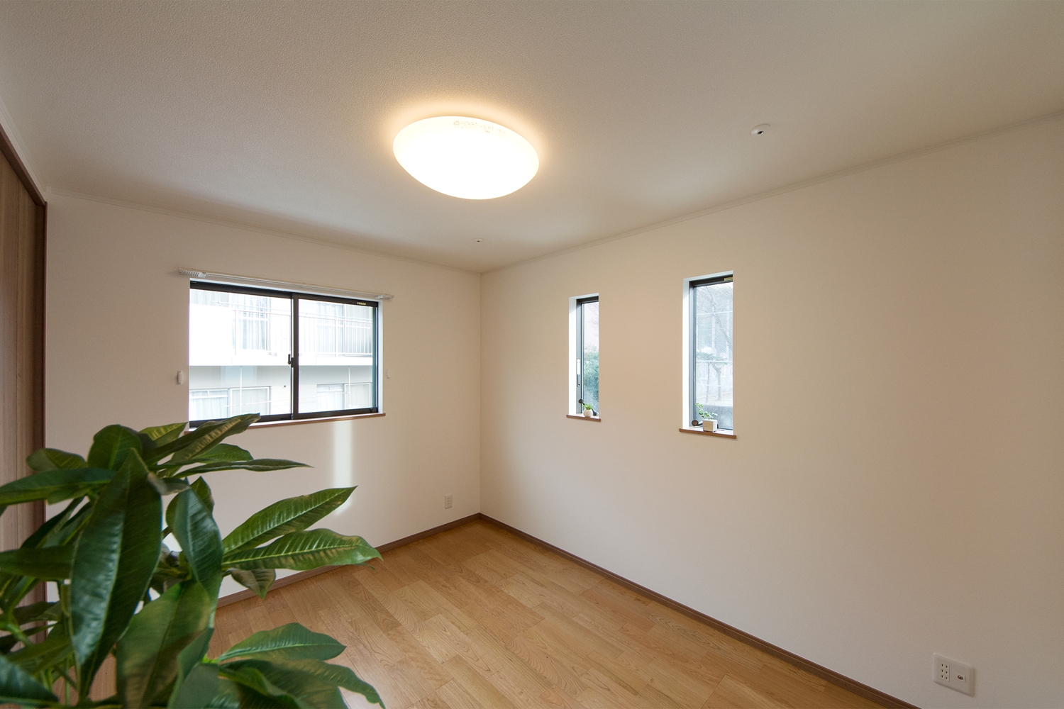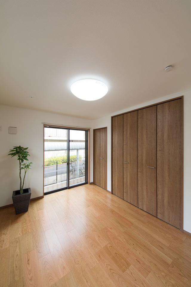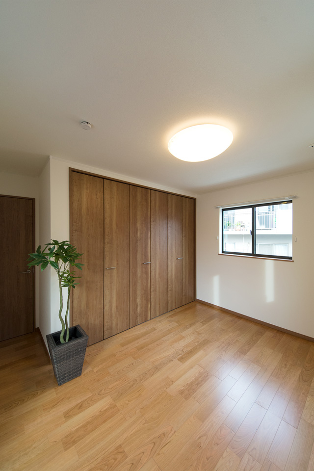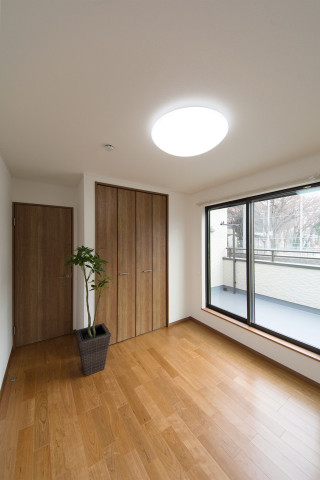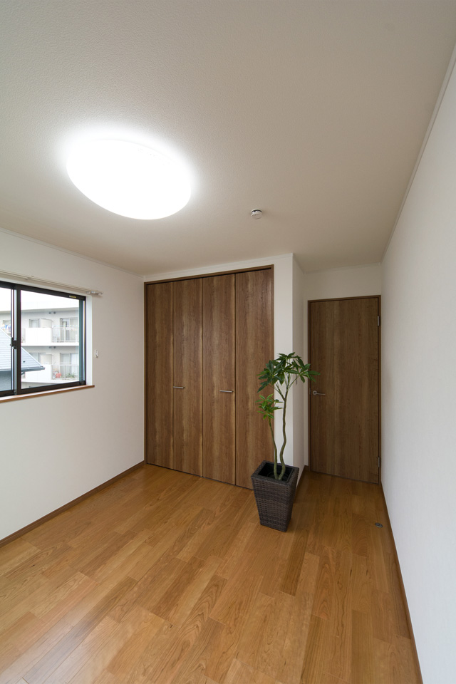 チェリー調の建具とフローリングがナチュラルな雰囲気を演出する2階洋室。