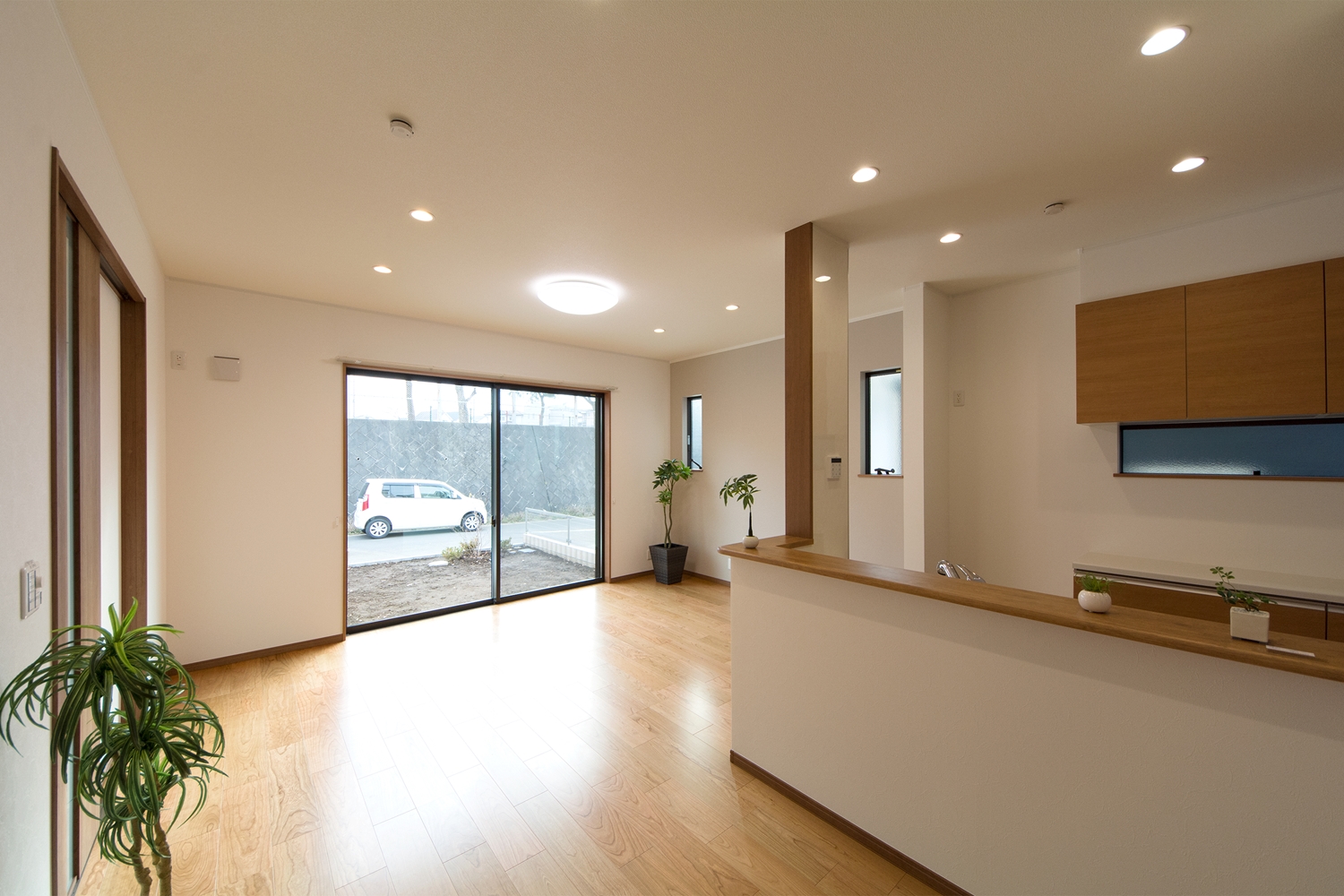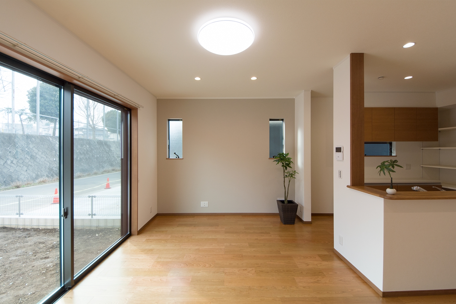 窓から自然のやさしい光が降り注ぎ、明るく開放的なリビング空間に。