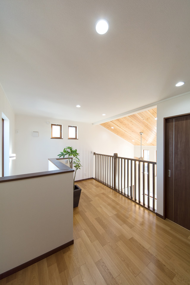勾配天井部分にあしらった杉の羽目板がナチュラルな空間を演出。