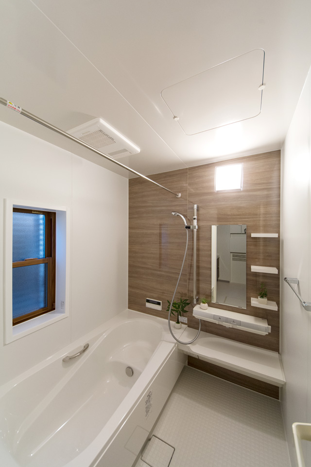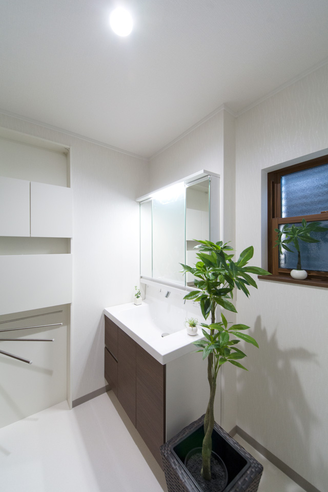 モカ色の洗面化粧台がナチュラルな雰囲気の空間を演出するサニタリールーム。