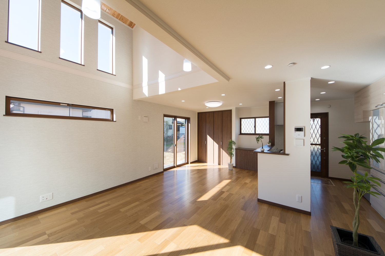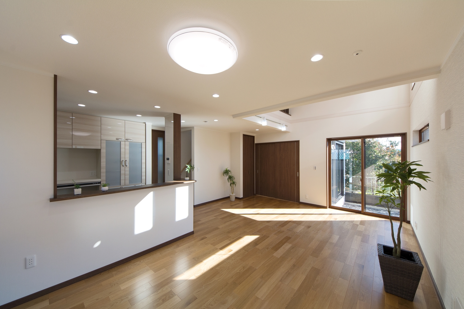 大きな窓から自然のやさしい光が降り注ぎ、明るく開放的なリビング空間を演出。