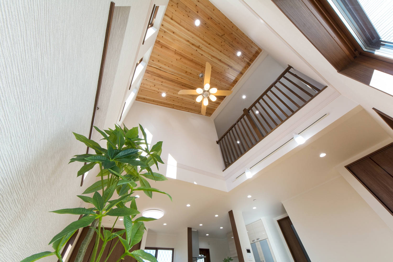 明るい光が差し込み、自然な風が入り込む開放感あるリビング。家族にゆるやかなつながりをもたらす大きな吹抜け。