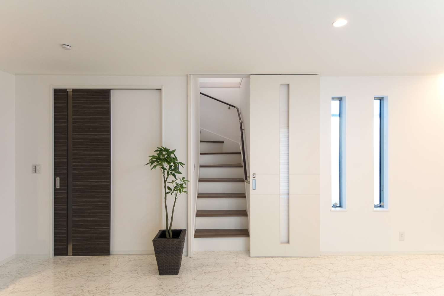 ブラウンの石積み調サイディングをベースに、黒のボーダー柄サイディングでアクセント。シックな表情で佇むスタイリッシュ&モダンに仕上がりました。