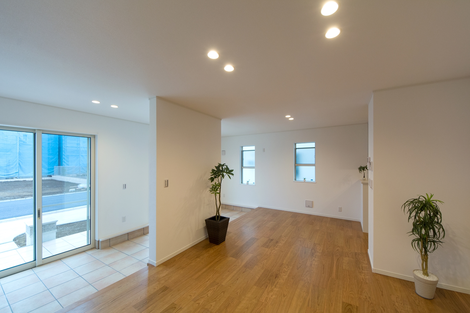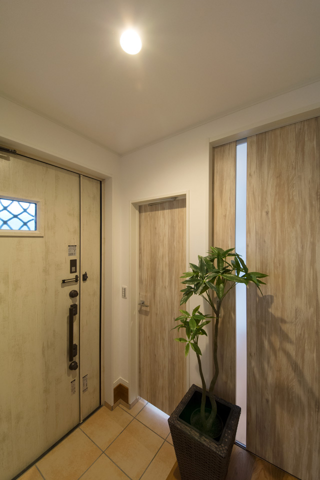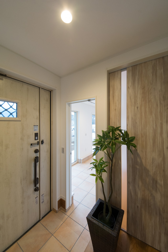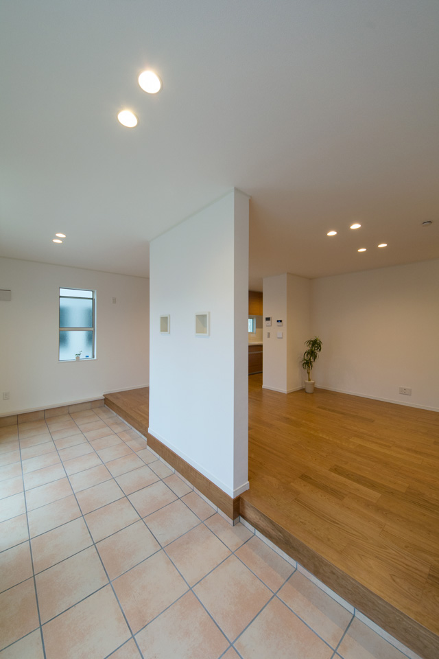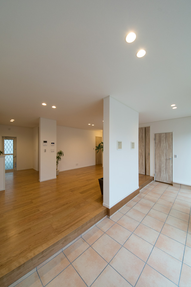 外と中の一体感が心地いい広いテラスとリビング。リゾートホテルのテラスで、庭を眺めながら食事をするような雰囲気を楽しむ事ができます。アプローチにはスロープを設え、インナーテラスに自転車をディスプレイすることもできます。