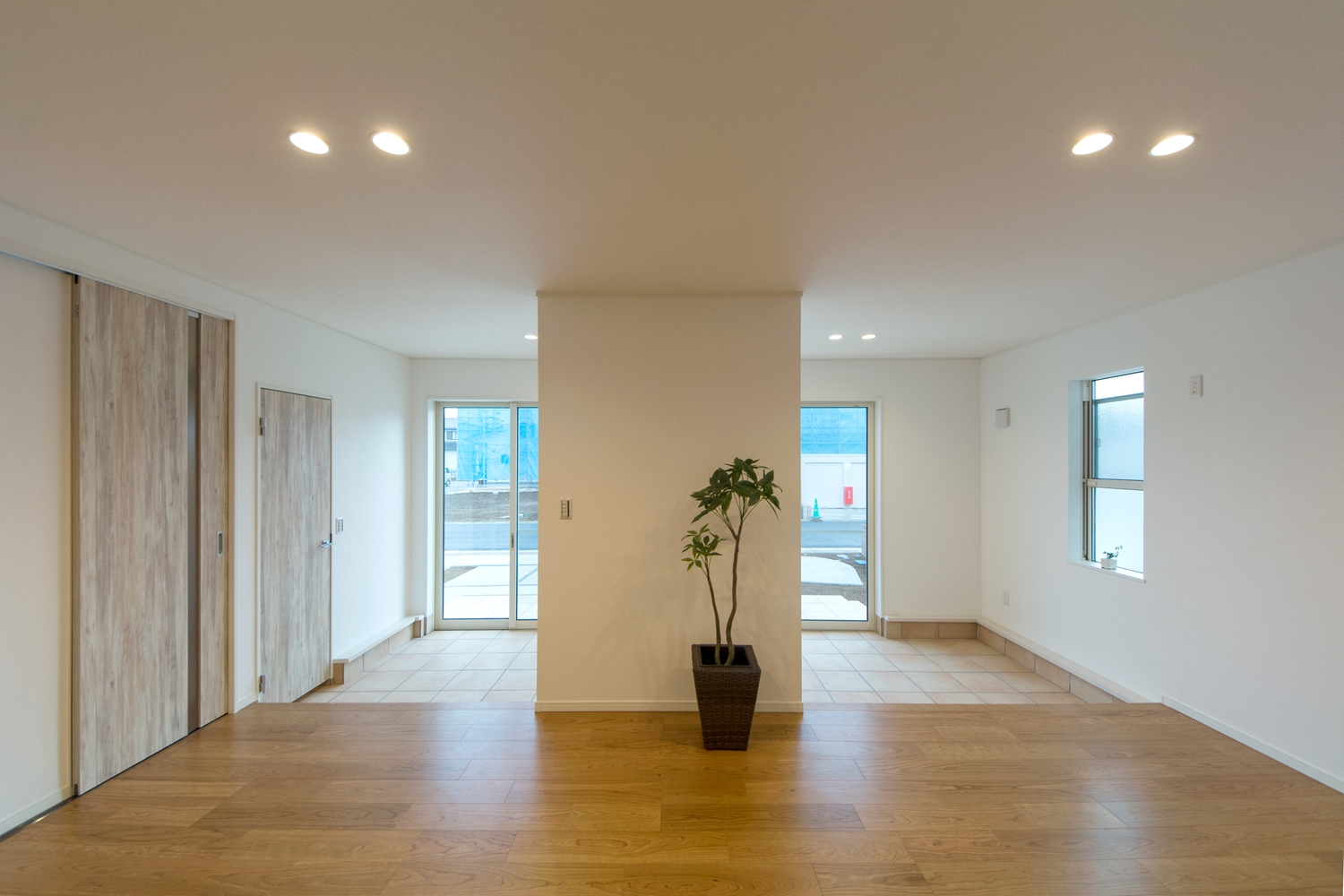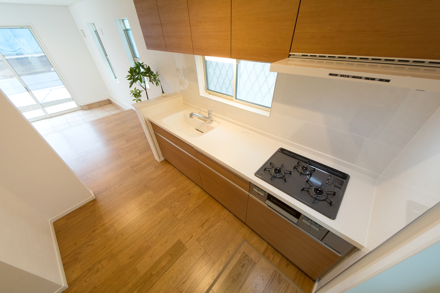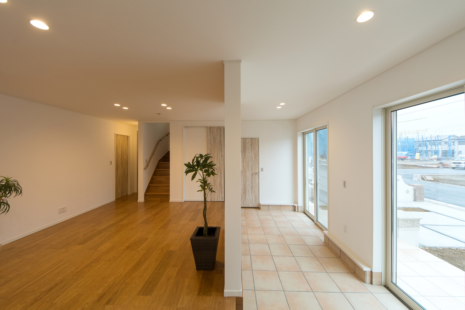 外と中の一体感が心地いい広いテラスとリビング。リゾートホテルのテラスで、庭を眺めながら食事をするような雰囲気を楽しむ事ができます。アプローチにはスロープを設え、インナーテラスに自転車をディスプレイすることもできます。