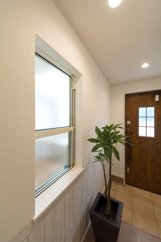 玄関手前の窓からオシャレなウッドデッキを見渡せる