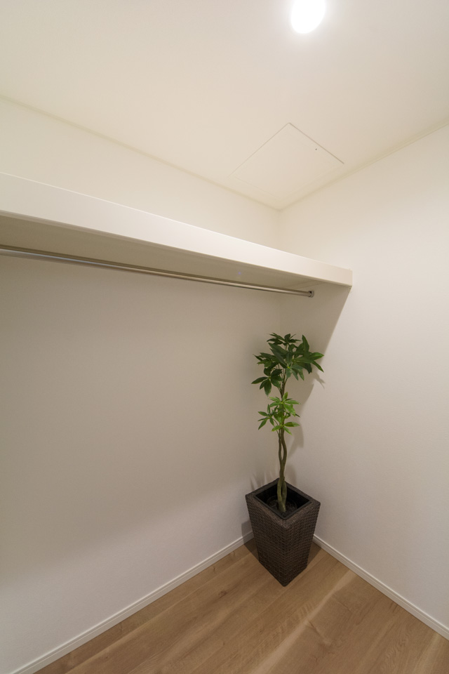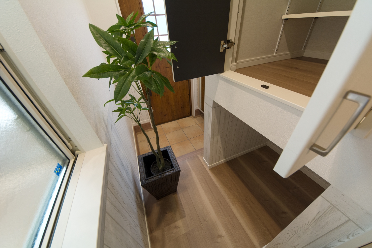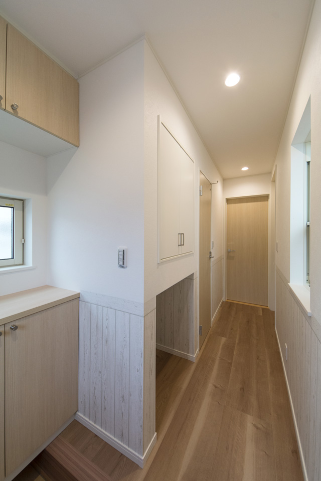 1階廊下。収納スペースを設け、散らかりがちなアイテムをまとめてスッキリ
