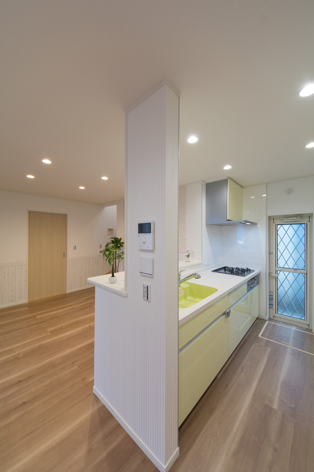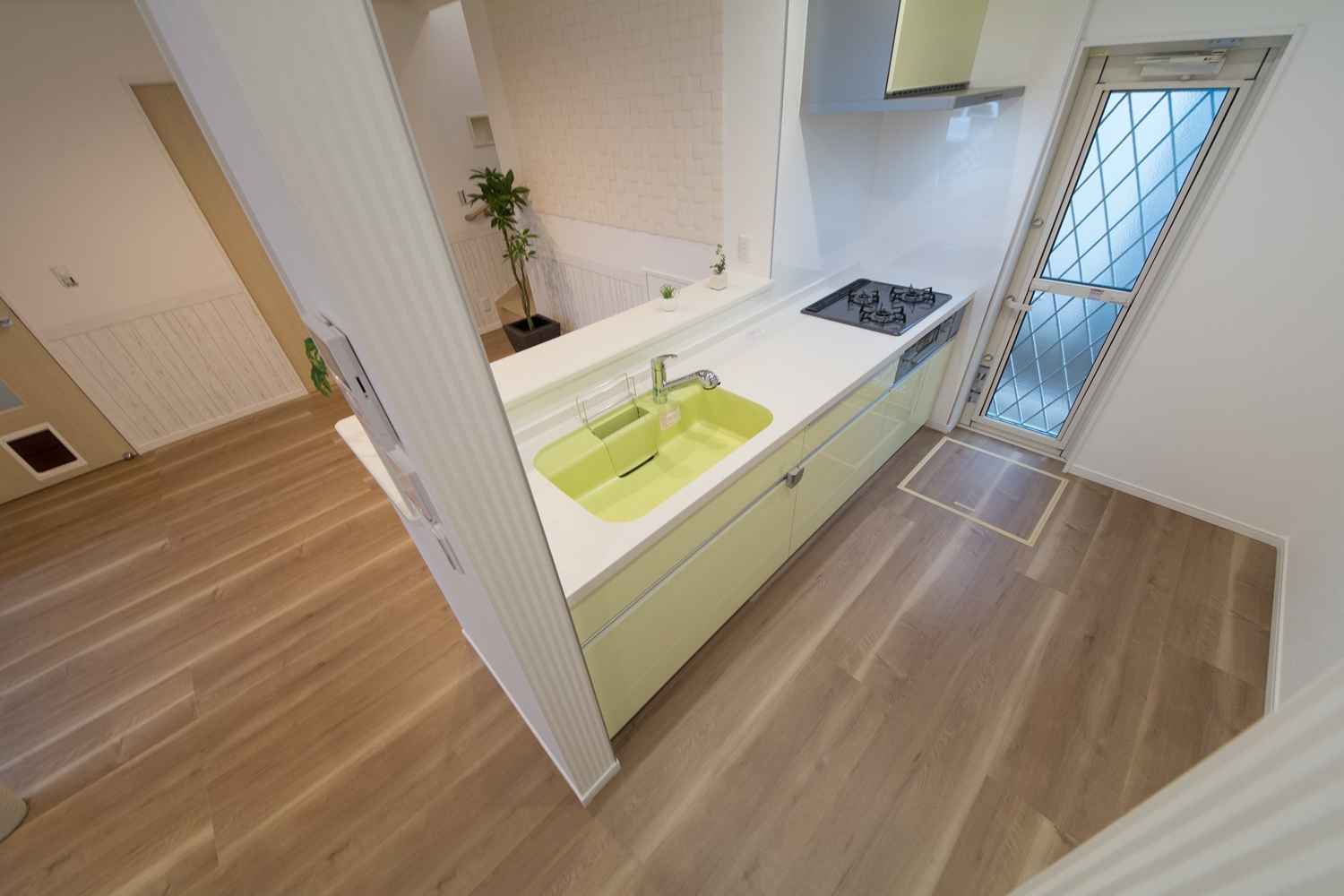 キッチンは白を基調に、ミストグリーンとライムグリーンをアクセントとし、明るい印象に