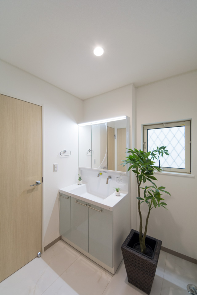 洗面化粧台の扉をパナシェアクア色でアクセント、清潔感のあるサニタリールーム。