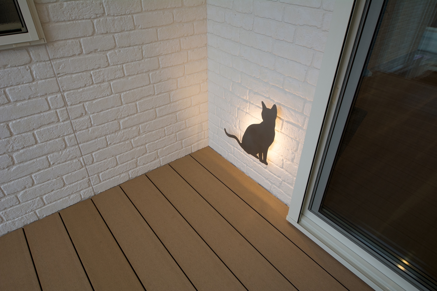 ウッドデッキの壁に、ネコをモチーフにしたペット好きにはたまらないオシャレで可愛らしい照明。