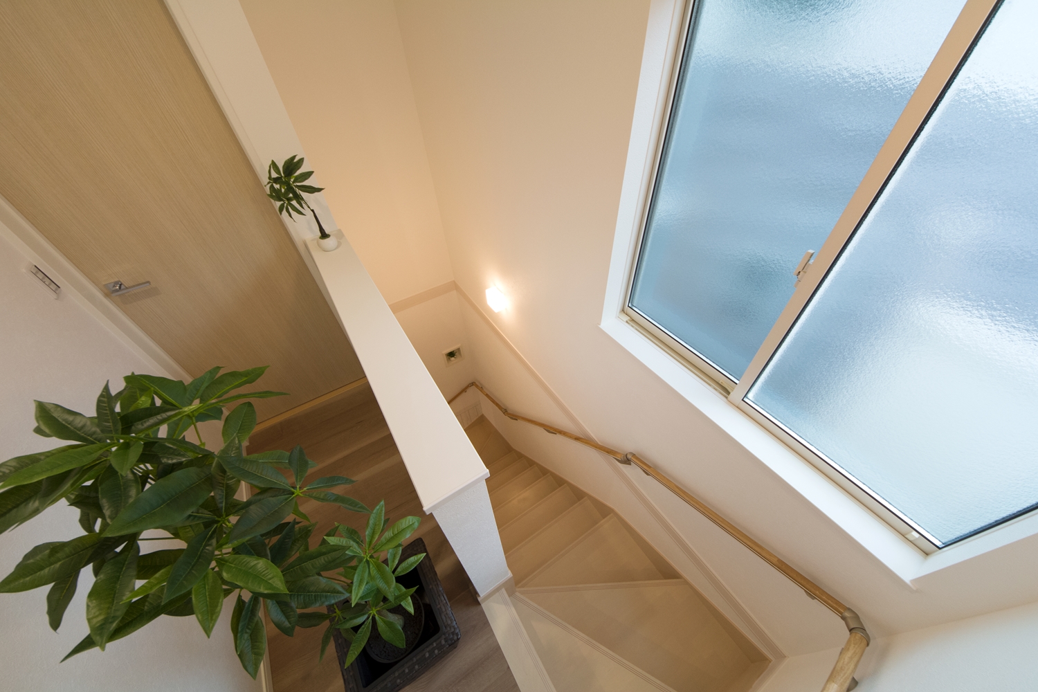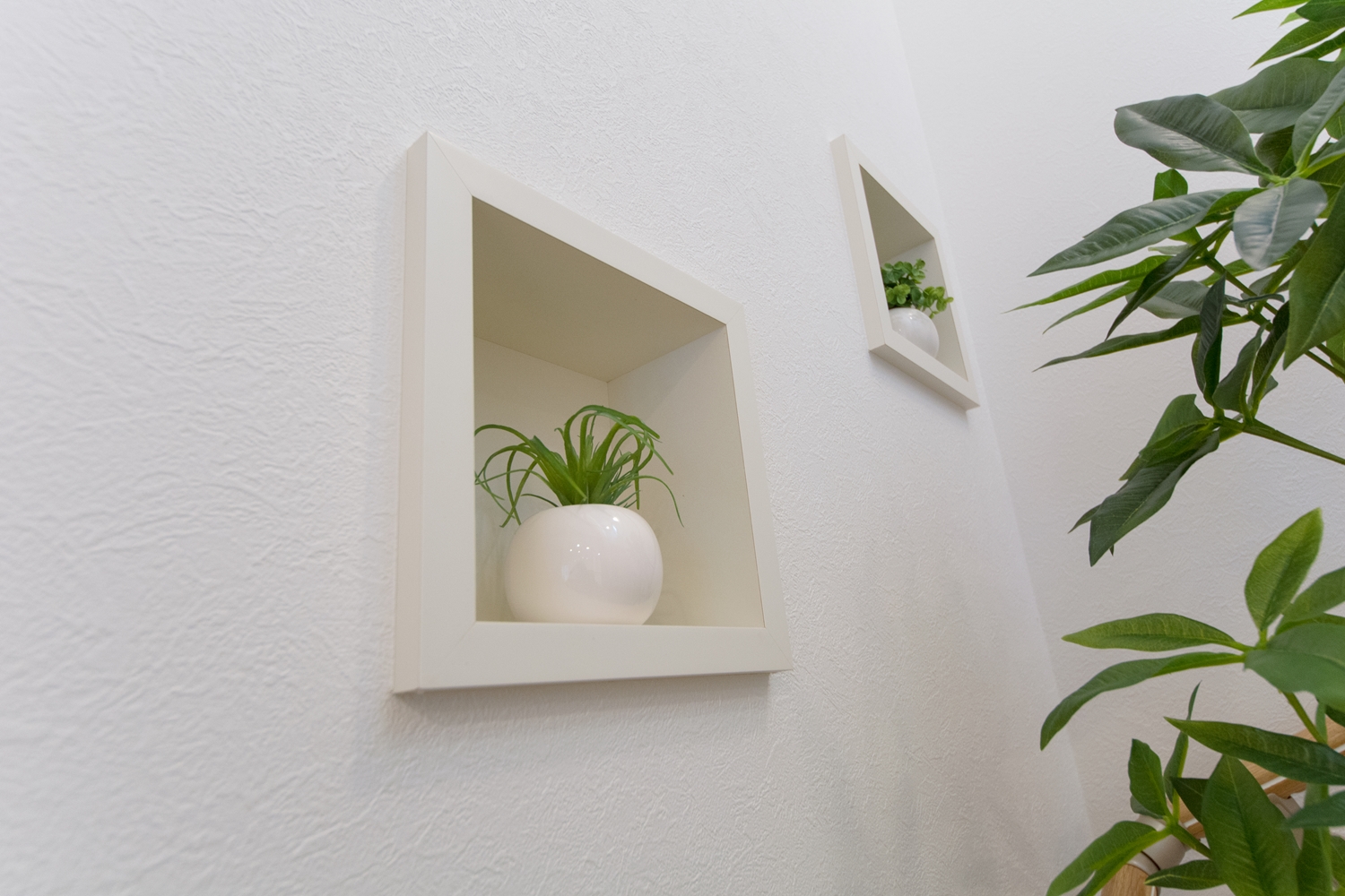 階段の飾り棚「ウォールニッチ」。観葉植物などでオシャレな空間を演出