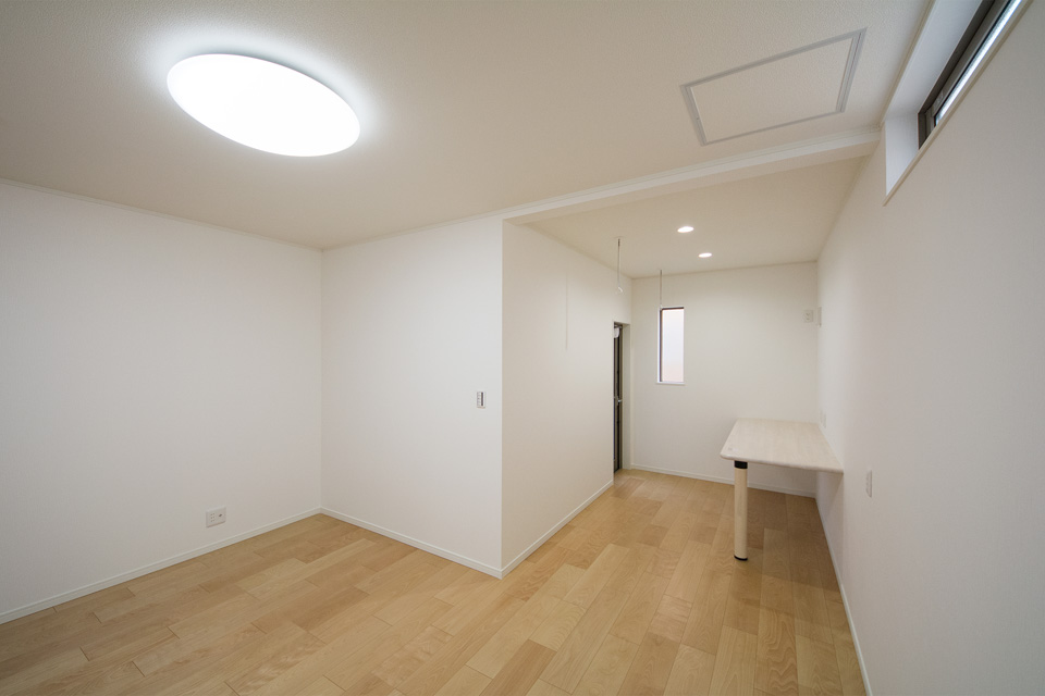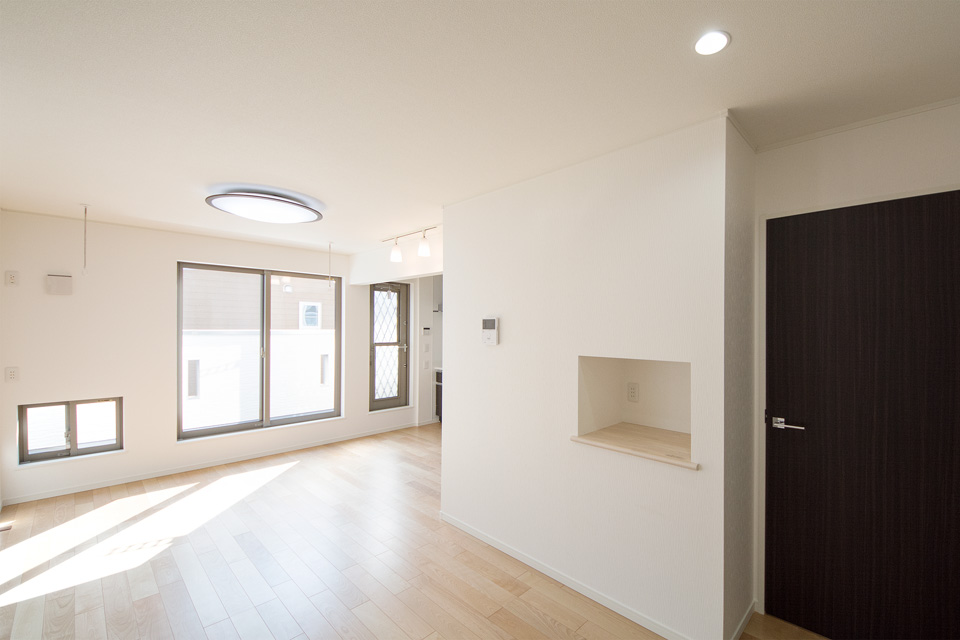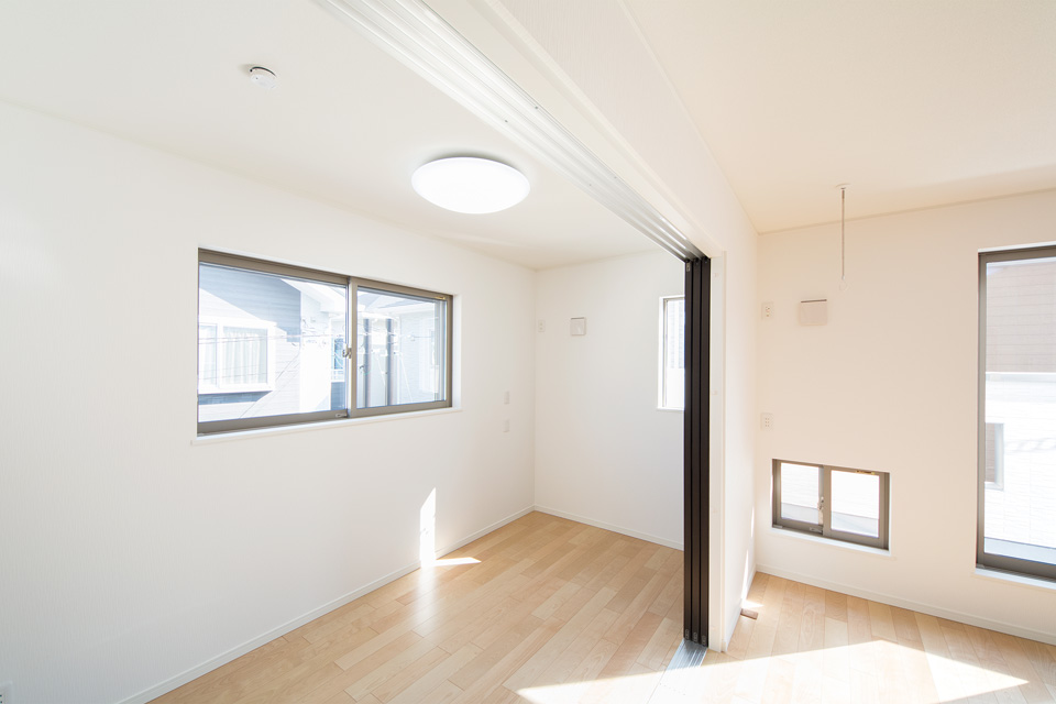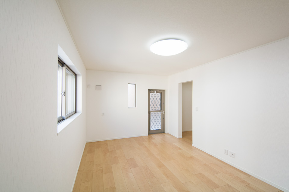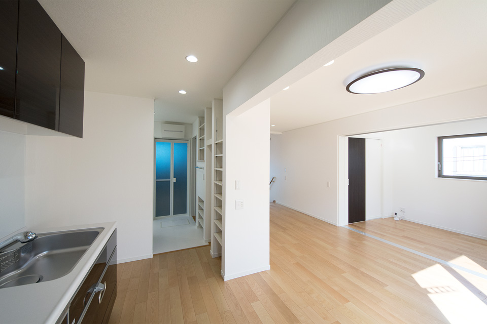 リビング・サニタリー・バスルーム間は、行き止まりのない「回遊動線」を取り入れ、家事の同時進行を快適に。 水まわり周辺に備えた棚収納のほか、各室にウォークインクローゼットを備えた収納豊富な間取。