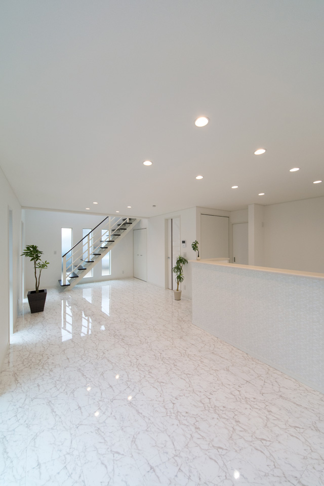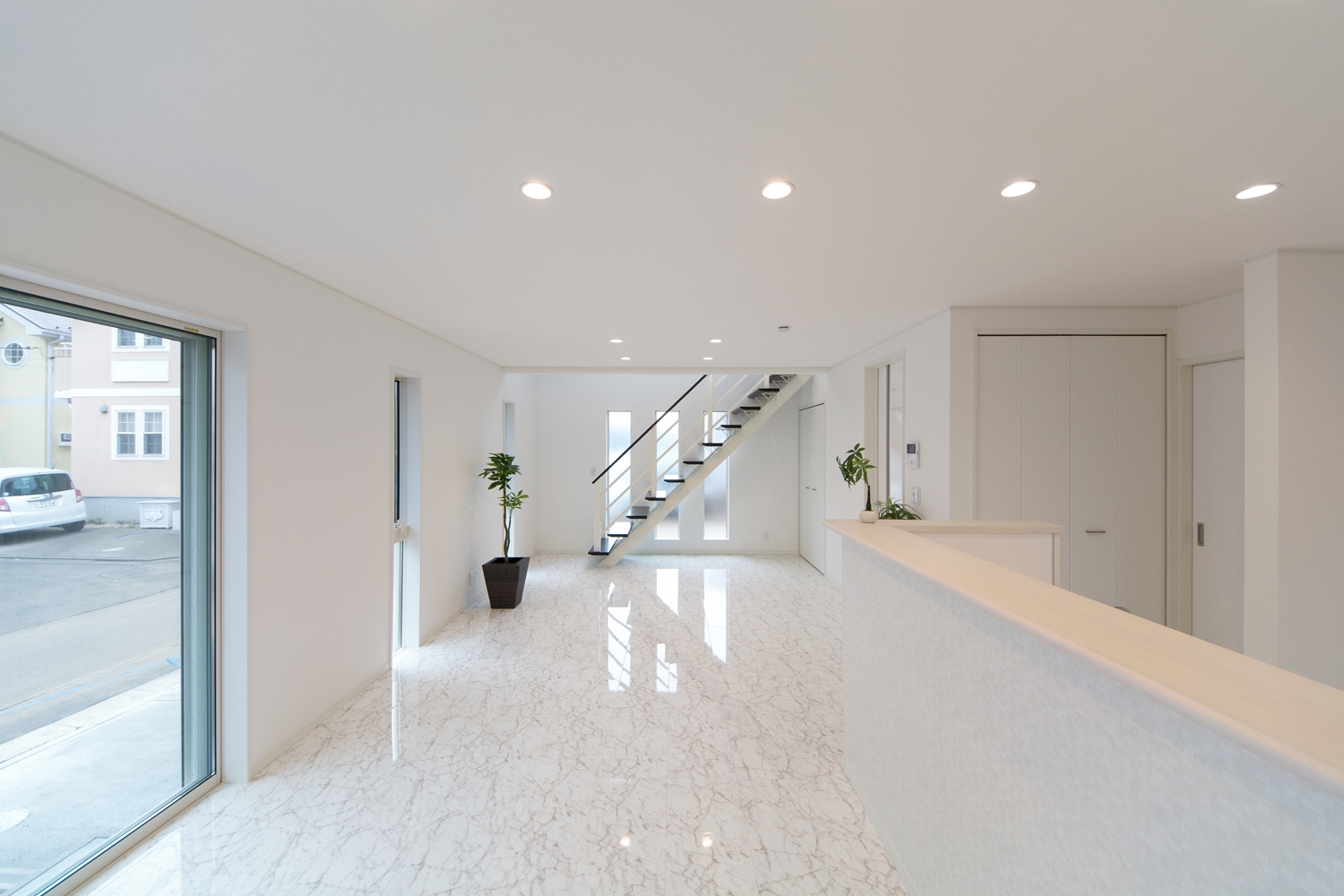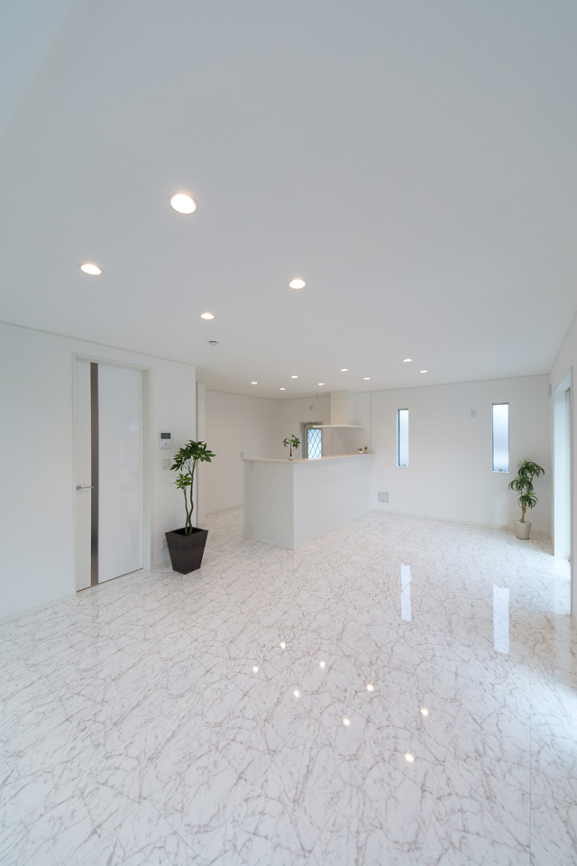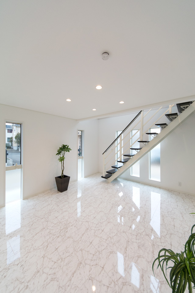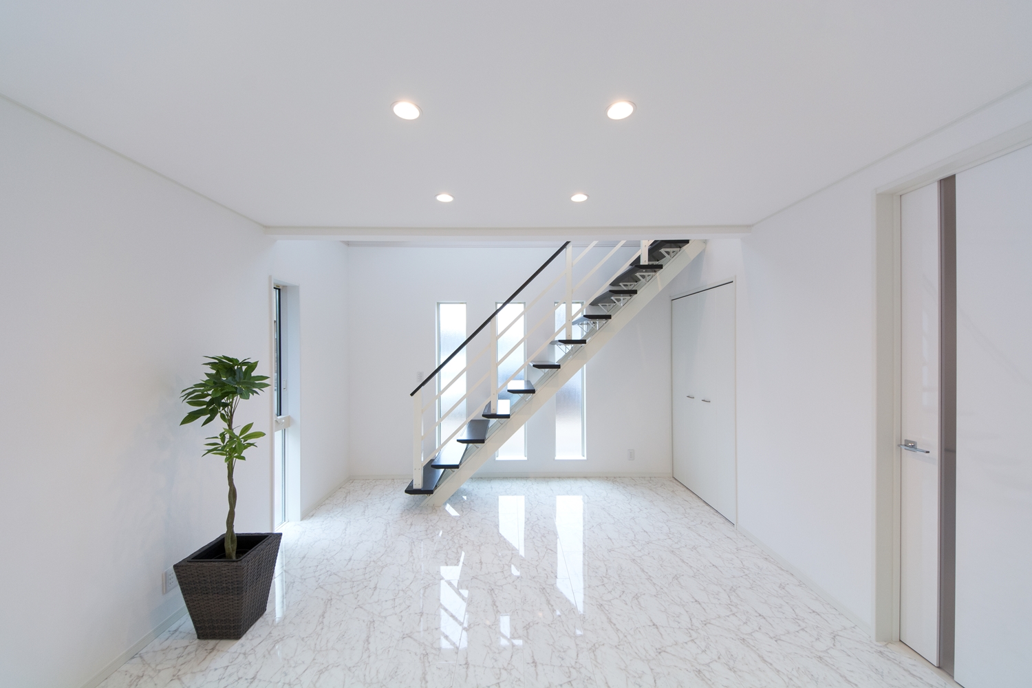 キューブ型の外観・凹凸の少ない間取りは人気のシンプルモダンスタイル。外観・内観ともホワイトを主色とすることで空間の広がりと明るさをもたらします。ホワイトベースの中でも鏡面ハイドア・大理石風フローリングなど異なった素材感が、白の深みを演出します。