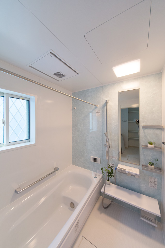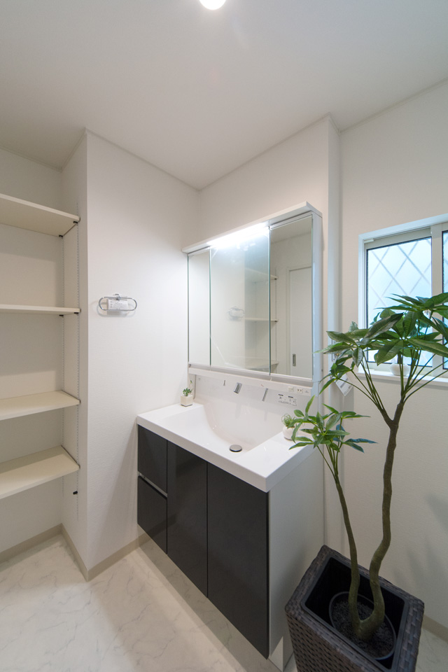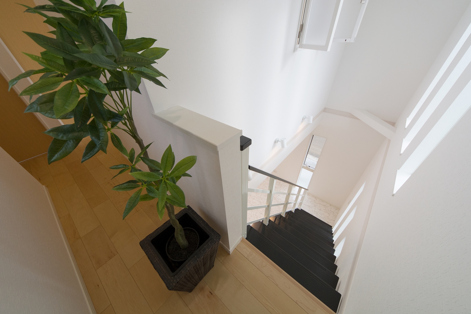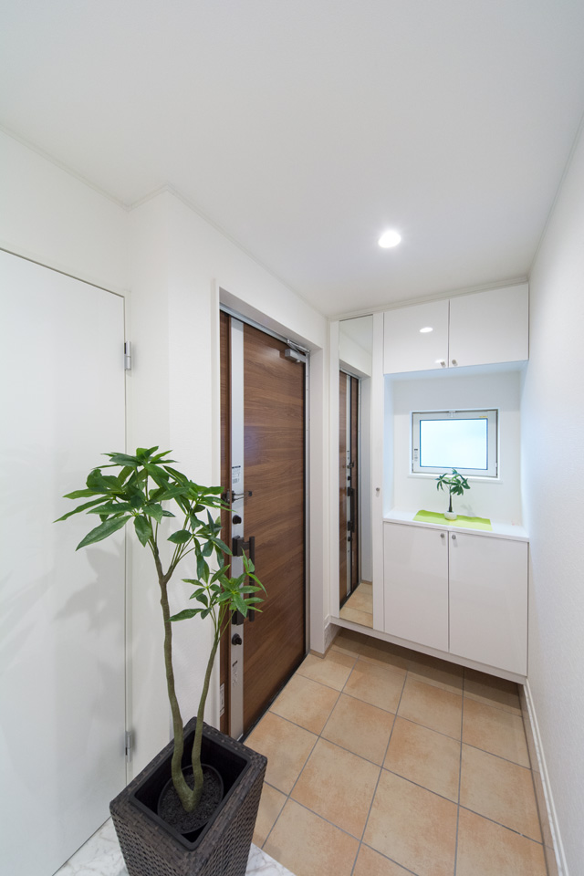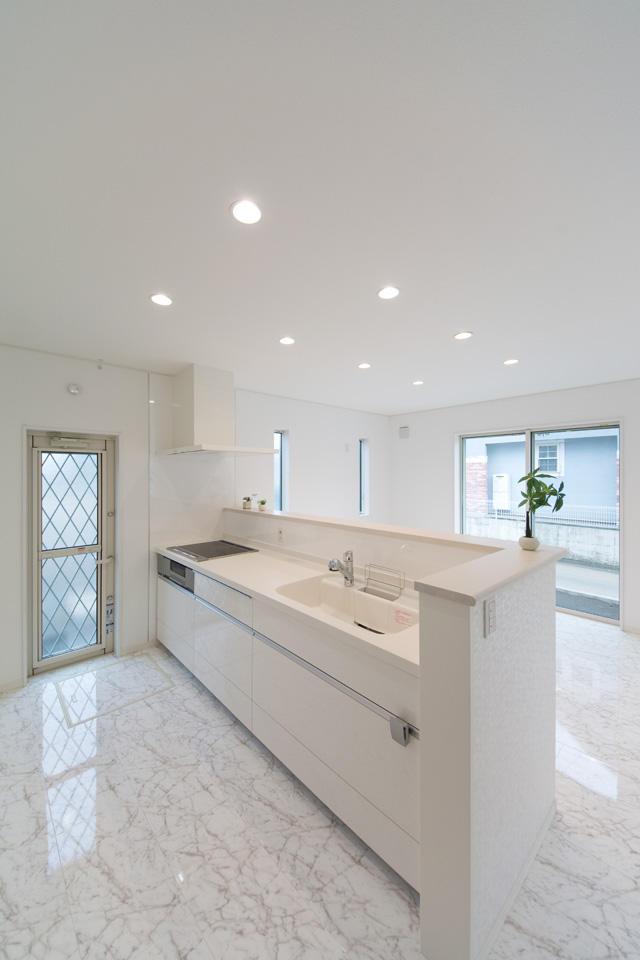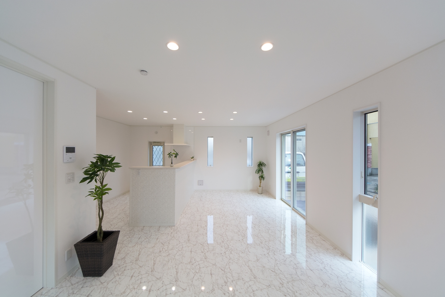 キューブ型の外観・凹凸の少ない間取りは人気のシンプルモダンスタイル。外観・内観ともホワイトを主色とすることで空間の広がりと明るさをもたらします。ホワイトベースの中でも鏡面ハイドア・大理石風フローリングなど異なった素材感が、白の深みを演出します。