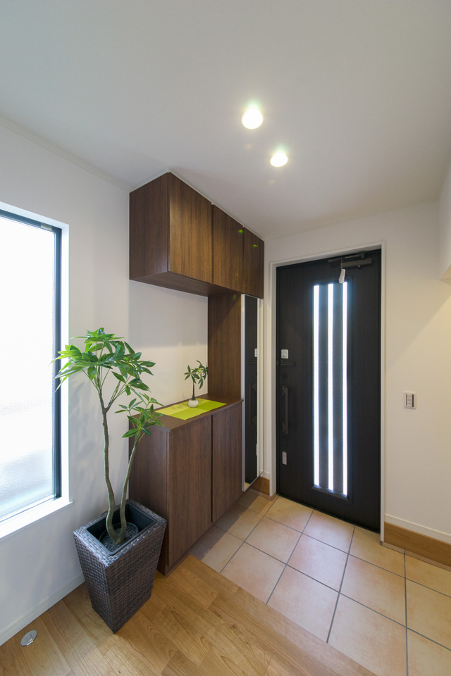 玄関ホール。ドアのストライプと窓の光が明るく照らし、テラコッタ調タイルが落ち着いた雰囲気を演出します。