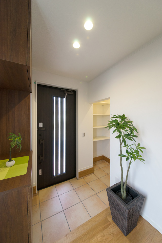 玄関脇に、土足でそのまま入れるシューズクロークを設えました。傘立てやベビーカー、ゴルフバックなども収納できて便利です。