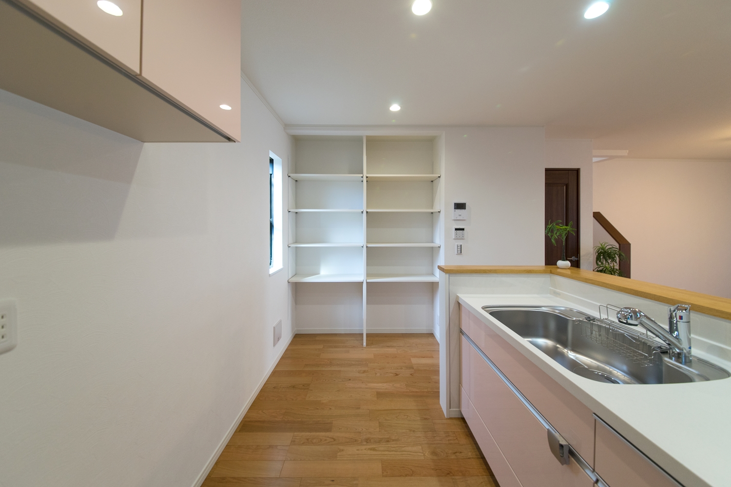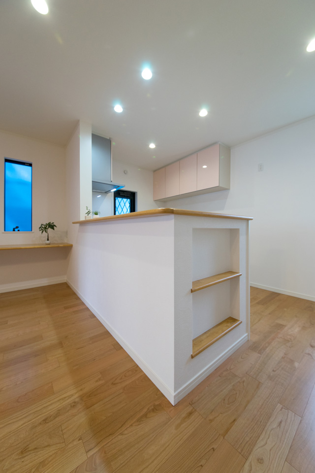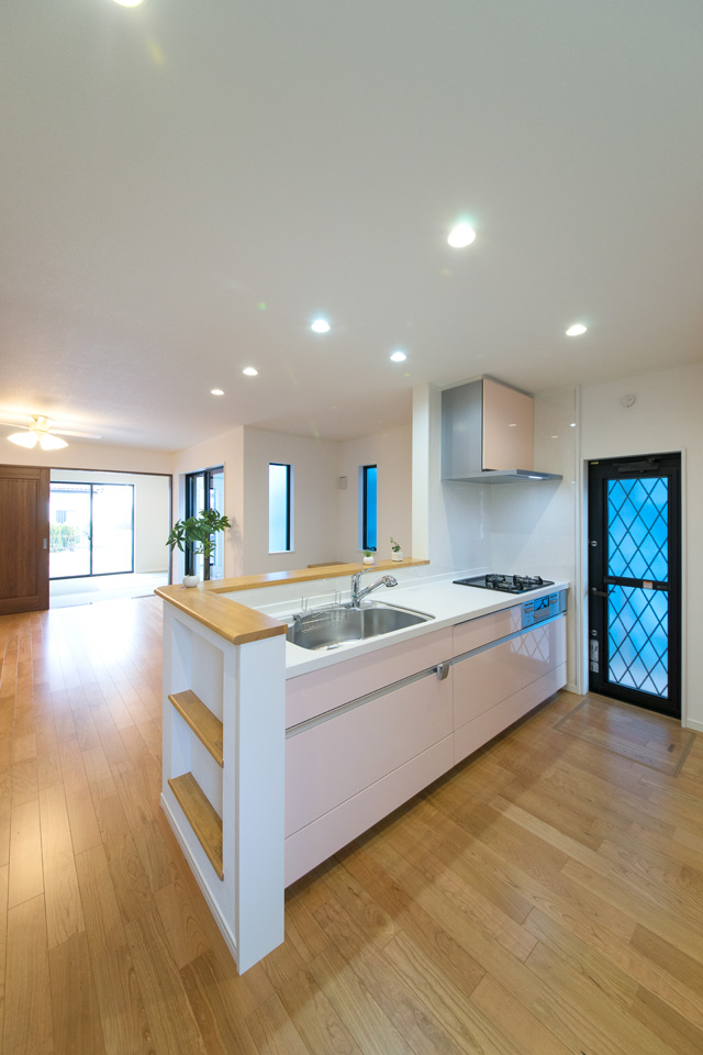 キッチン扉はミストピンク色で可愛らしく、カウンターはバーチ素材でナチュラルに、全体的にやさしく温かみのある印象に仕上がりました。
