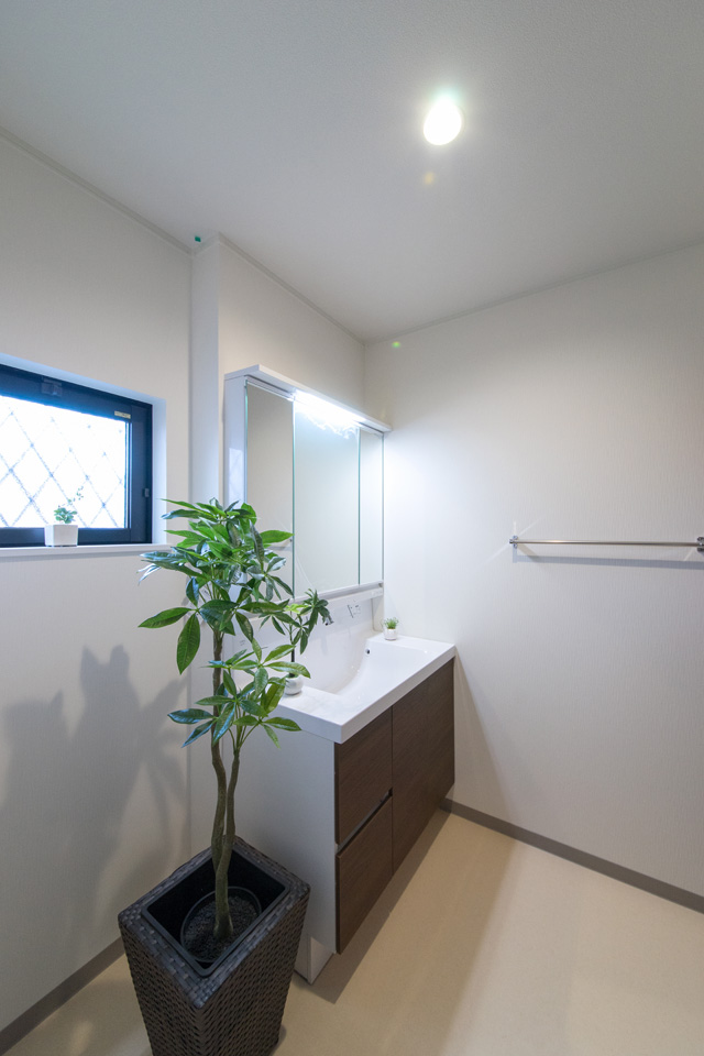 洗面化粧台扉をクリエモカ色でアクセント、清潔感のあるサニタリールーム。