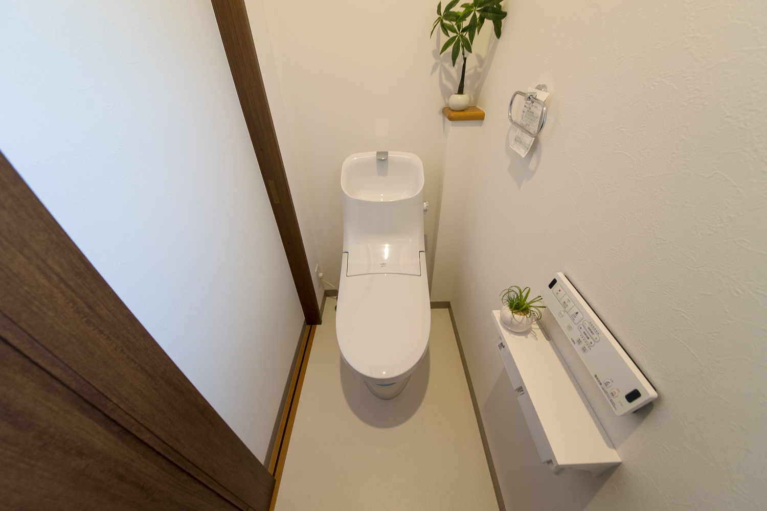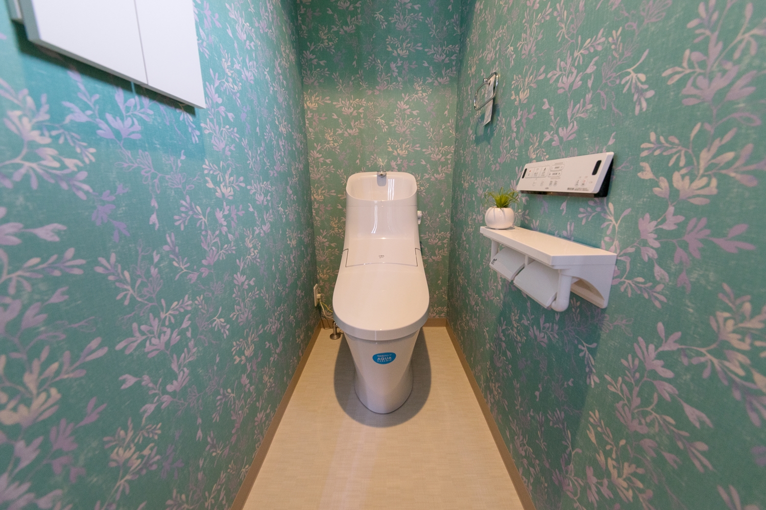 2Fトイレ。グリーンを背景に、植物柄を描いたクロスは、オリジナルでエキゾチックな空間を演出します。