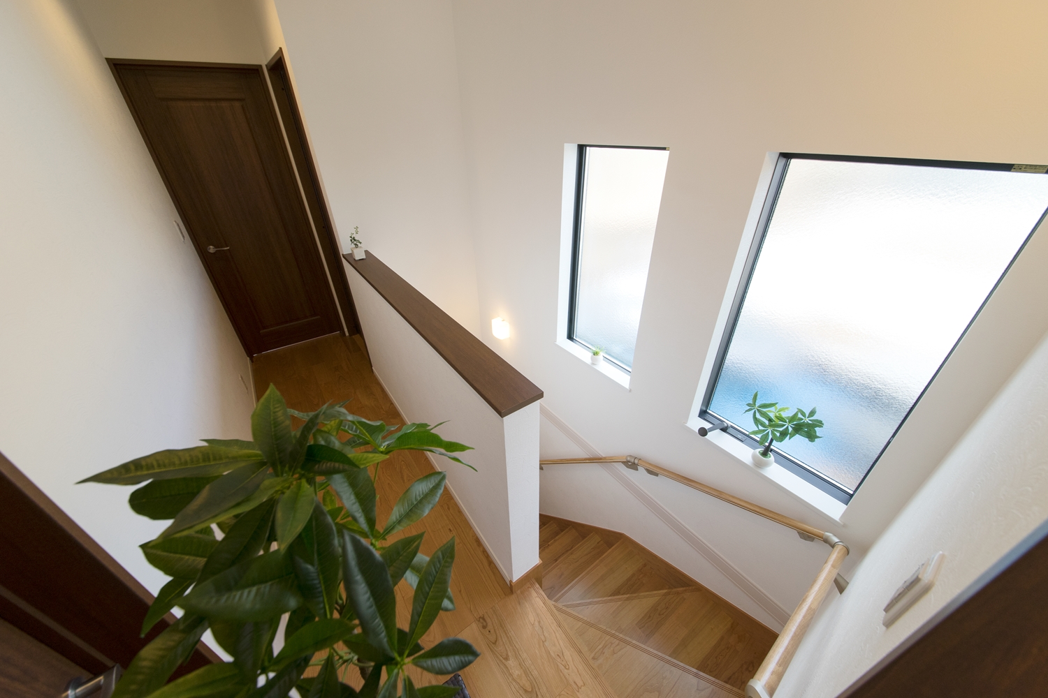 窓の光が差し込む、明るい階段。手摺を設置して上り下りも安全です。