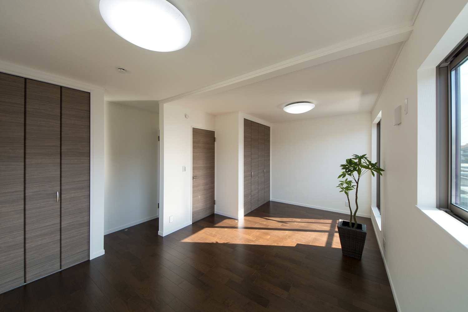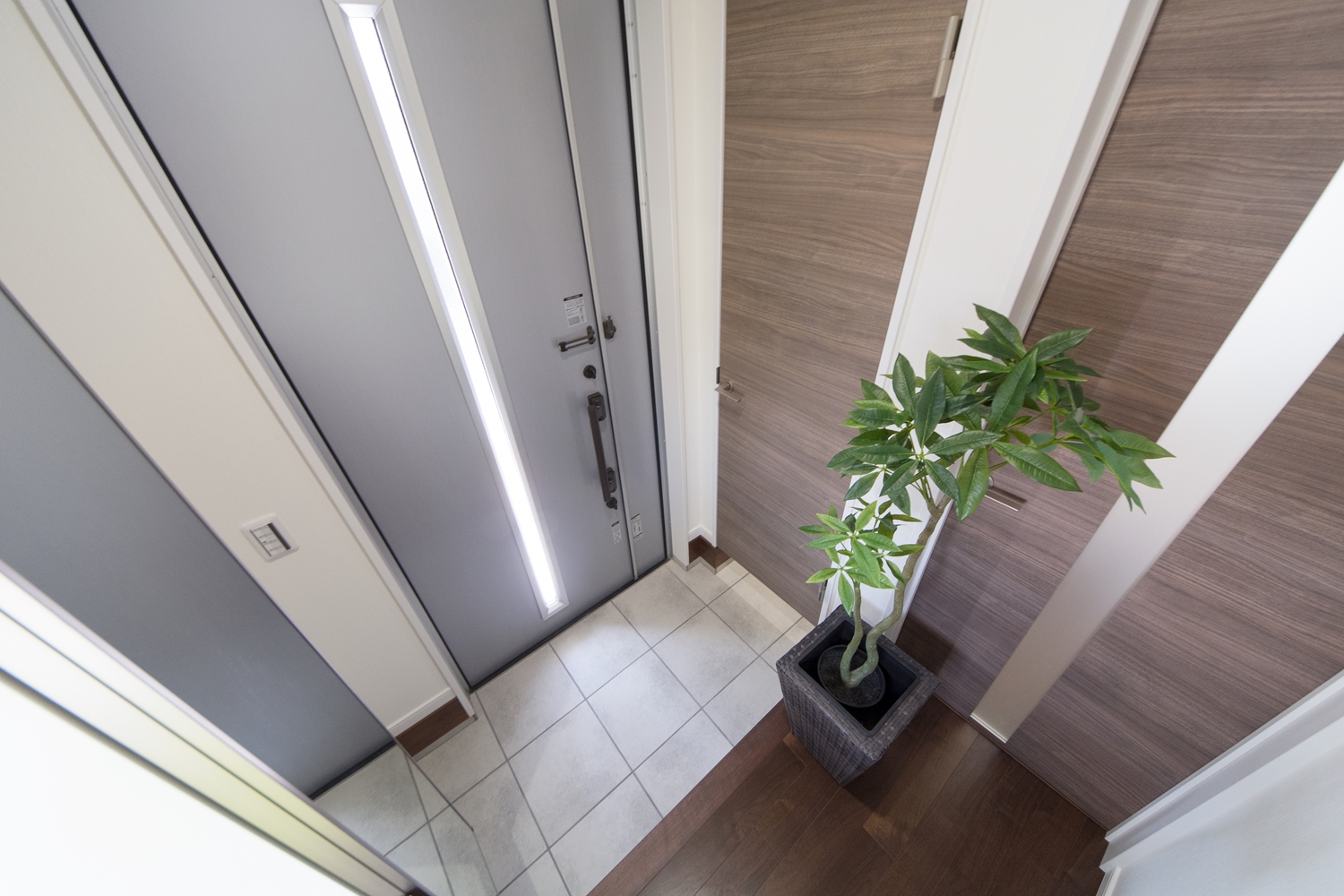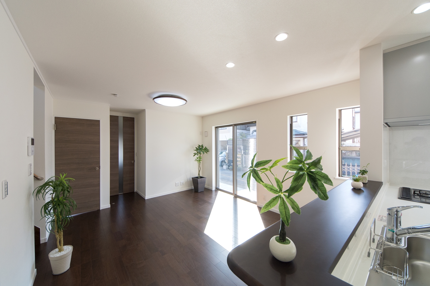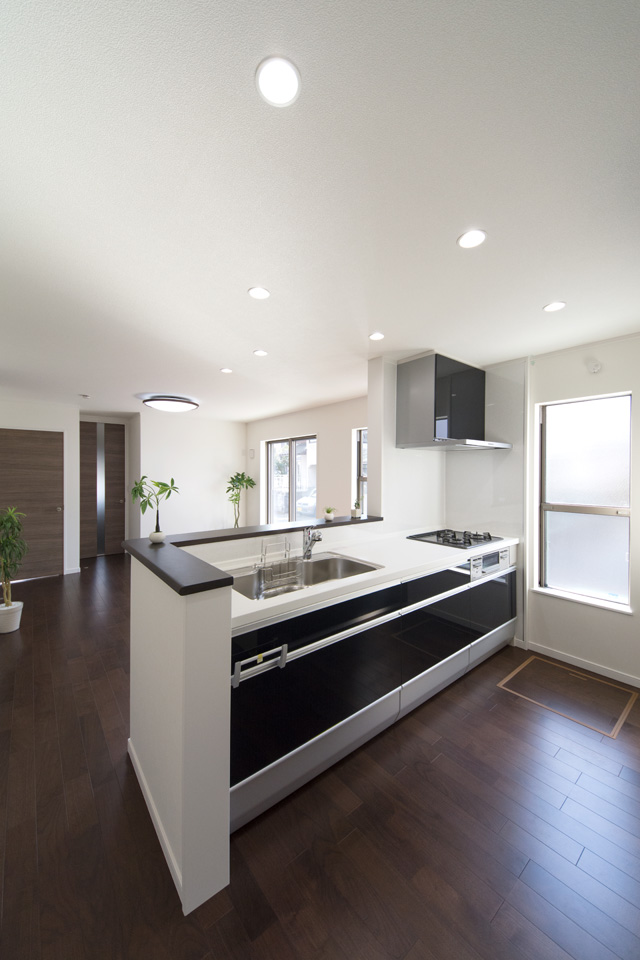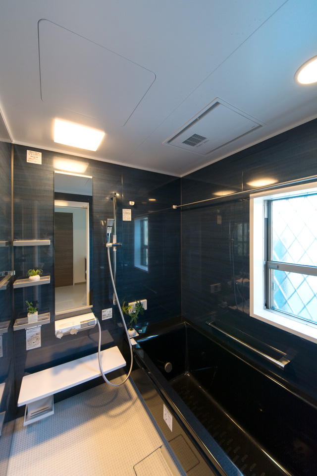 背が高く傾斜の屋根、濃いチャコール色の外観は、スタイリッシュでインパクトがあります。「勾配天井」とは、屋根の勾配に合わせて傾斜を持たせた天井のことです。天井を抜いて高さを出すことによって開放感をもたらし、より快適な生活空間を作ることができます。