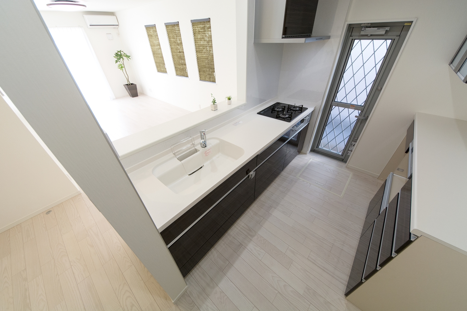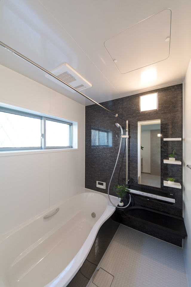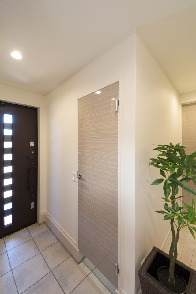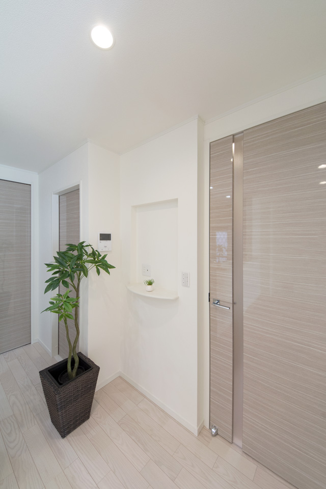 グレーの外壁は、整然と積み上げられた細石の意匠。モノトーンで洗礼されたイメージを演出します。白の外壁はシンプルなボーダータイル柄で深くシャープな表情がスッキリとした印象を与えます。グレー×白のクールでスタイリッシュな外観に仕上がりました。