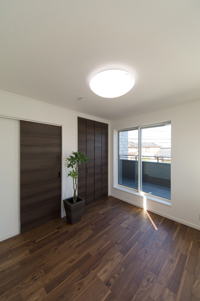 2F洋室。ブラックウォルナットのフローリングとショコラオークのクローゼットが、シックでラグジュアリーな空間を演出します。