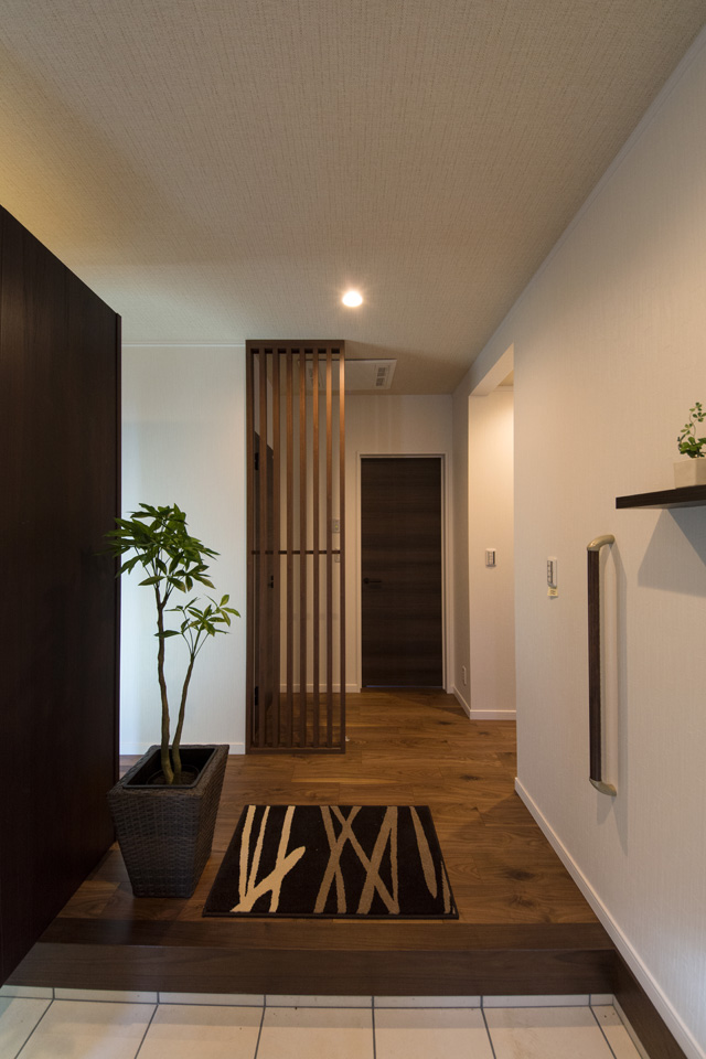 大人の雰囲気漂う、落ち着いた玄関ホール。玄関の昇り降りをやさしくサポートする手摺を設置しました。