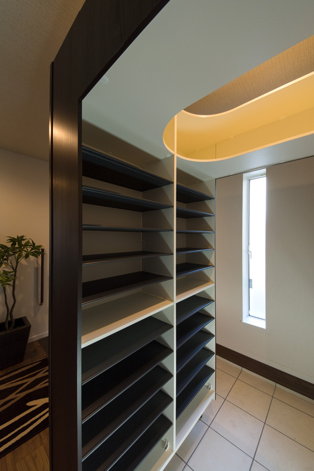 お洒落なシューズBOXを設えました。家族用と来客用に入口を分けて使うのも良いですね。
