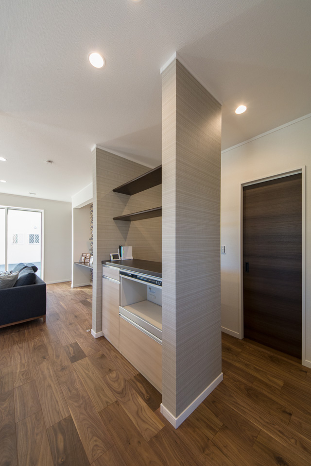 玄関、シューズBOX側。ベビーカーなども置けてママには嬉しいスペースです。こちらを家族専用にするのも一つで、ゲスト側はいつでもスッキリです!